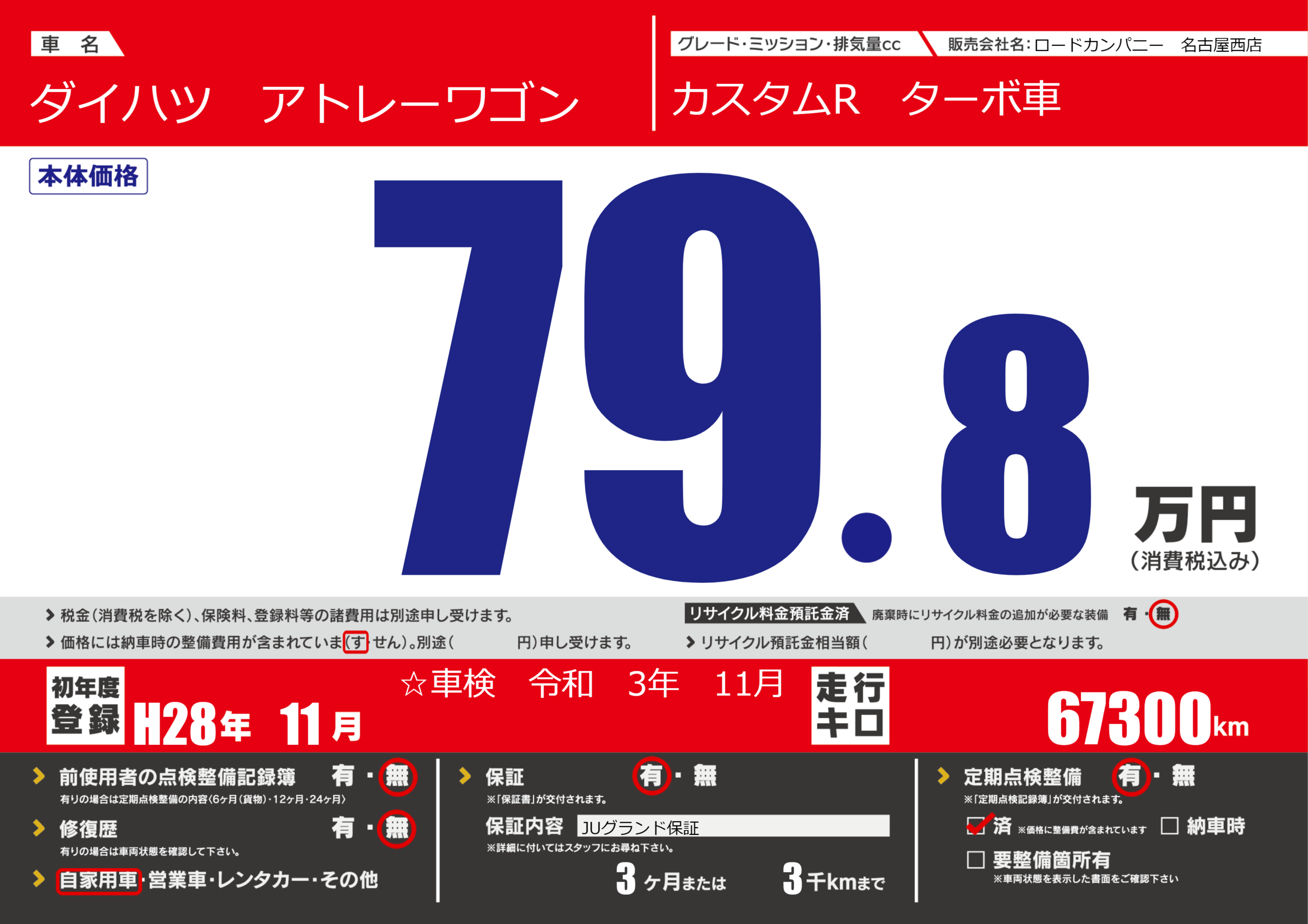 | 定期点検整備 | 定期点検整備あり 定期点検整備済み | ||