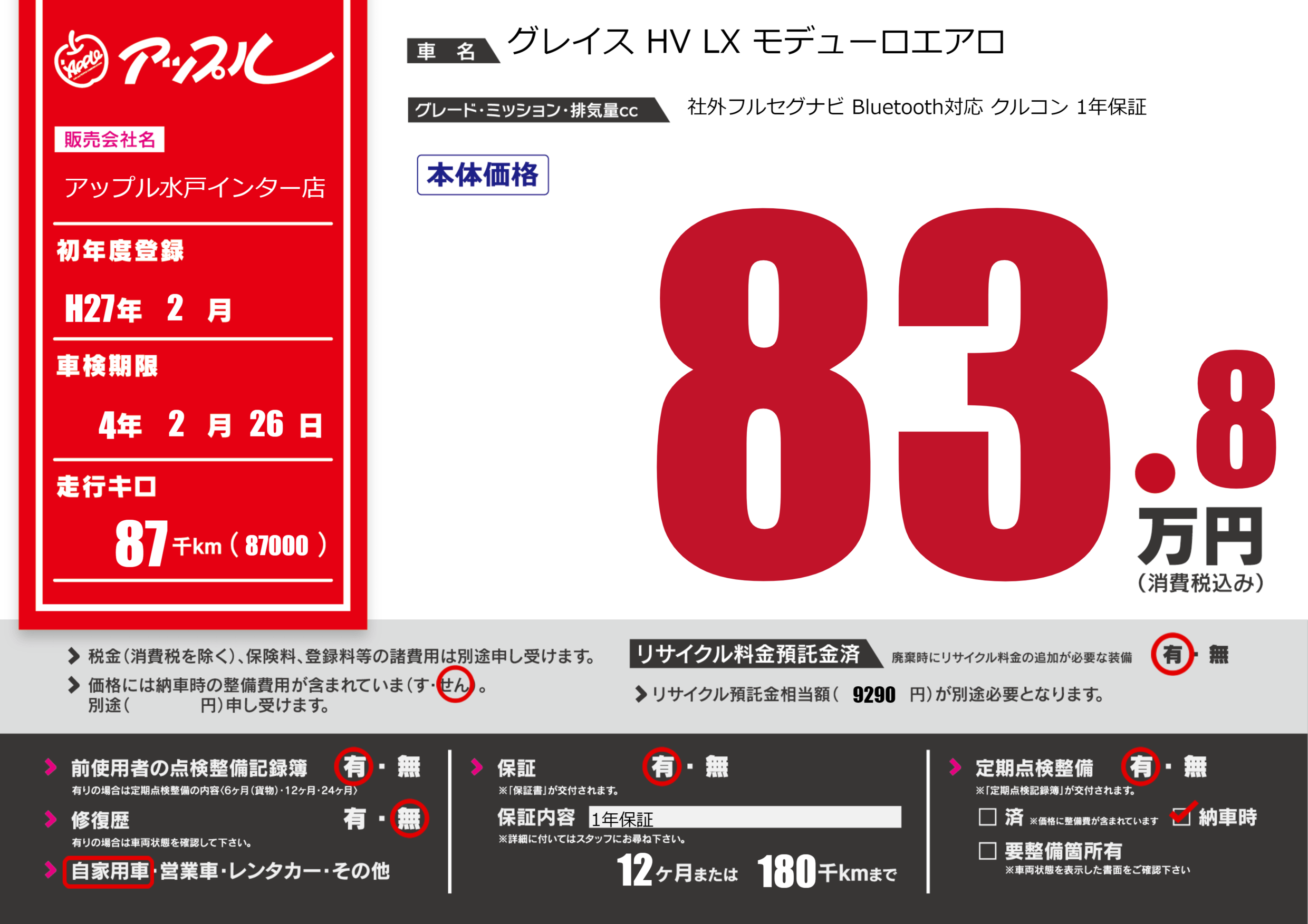 | 車名 | グレイス HV LX モデューロエアロ | グレード ミッション 排気量 |