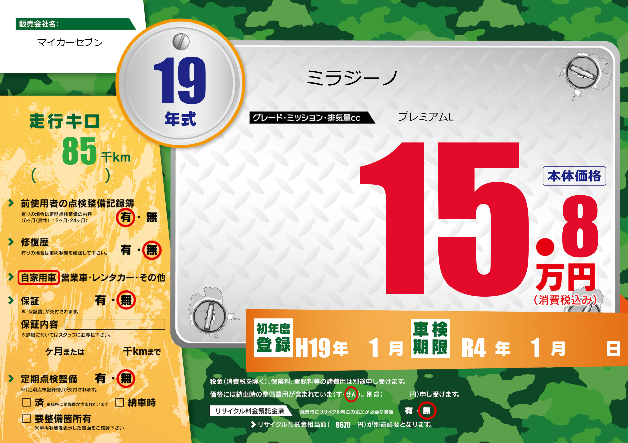 なし | 車検制限 | R4年1月---月 |