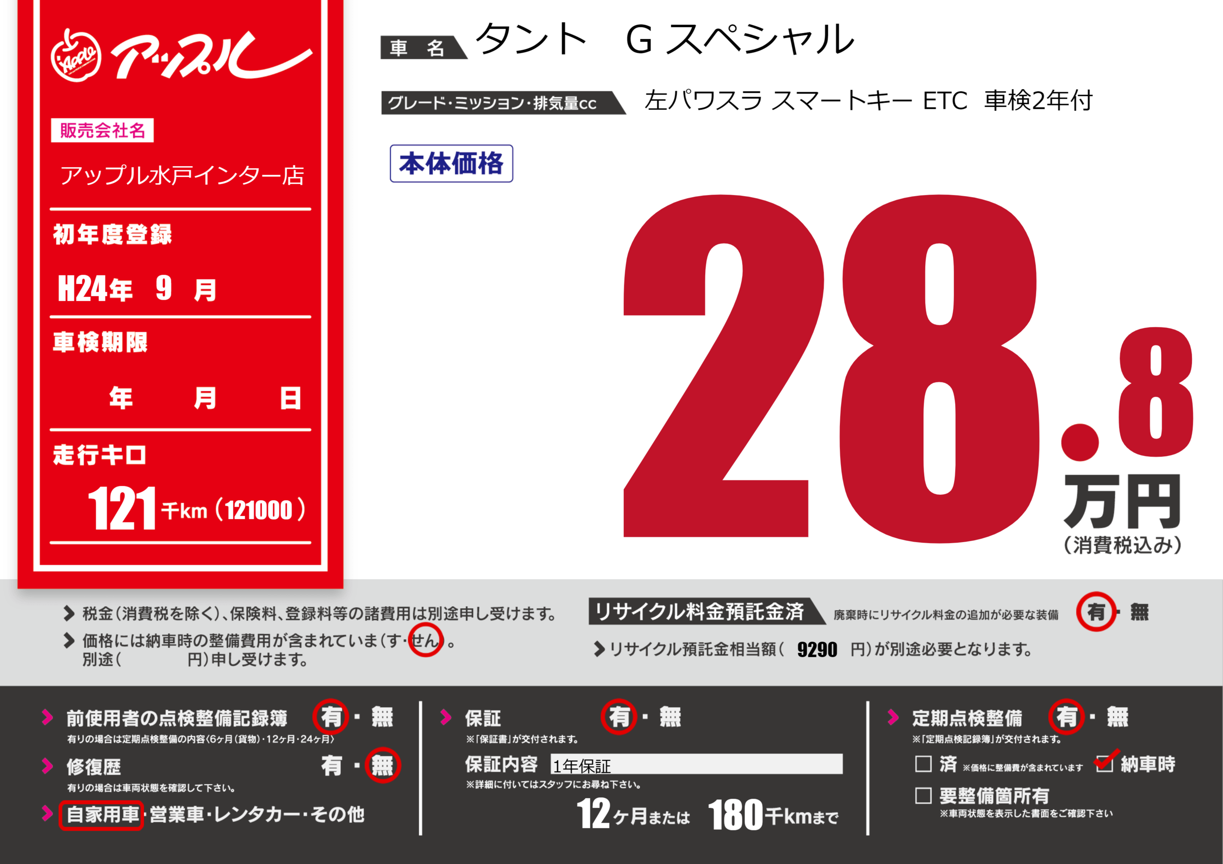 | 車名 | タント G スペシャル | グレード ミッション 排気量 |