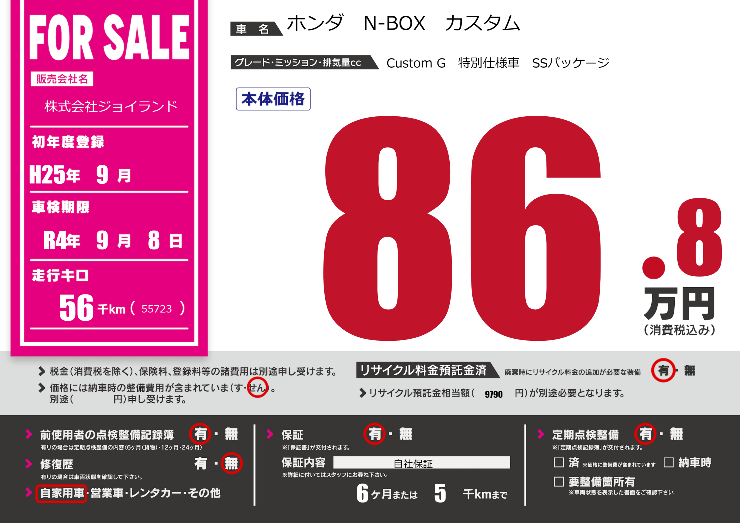 | 車名 | ホンダ N-BOX カスタム | グレード ミッション 排気量 |