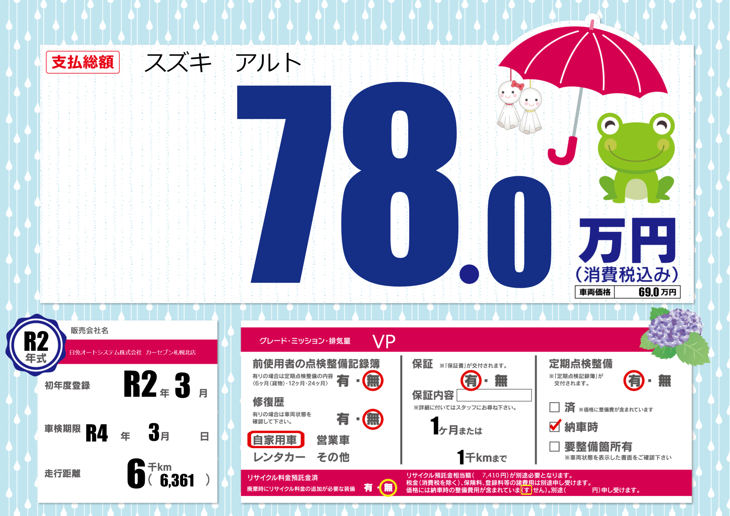 | 走行キロ | 0.6万km | 初年度登録 | R2年3月 |