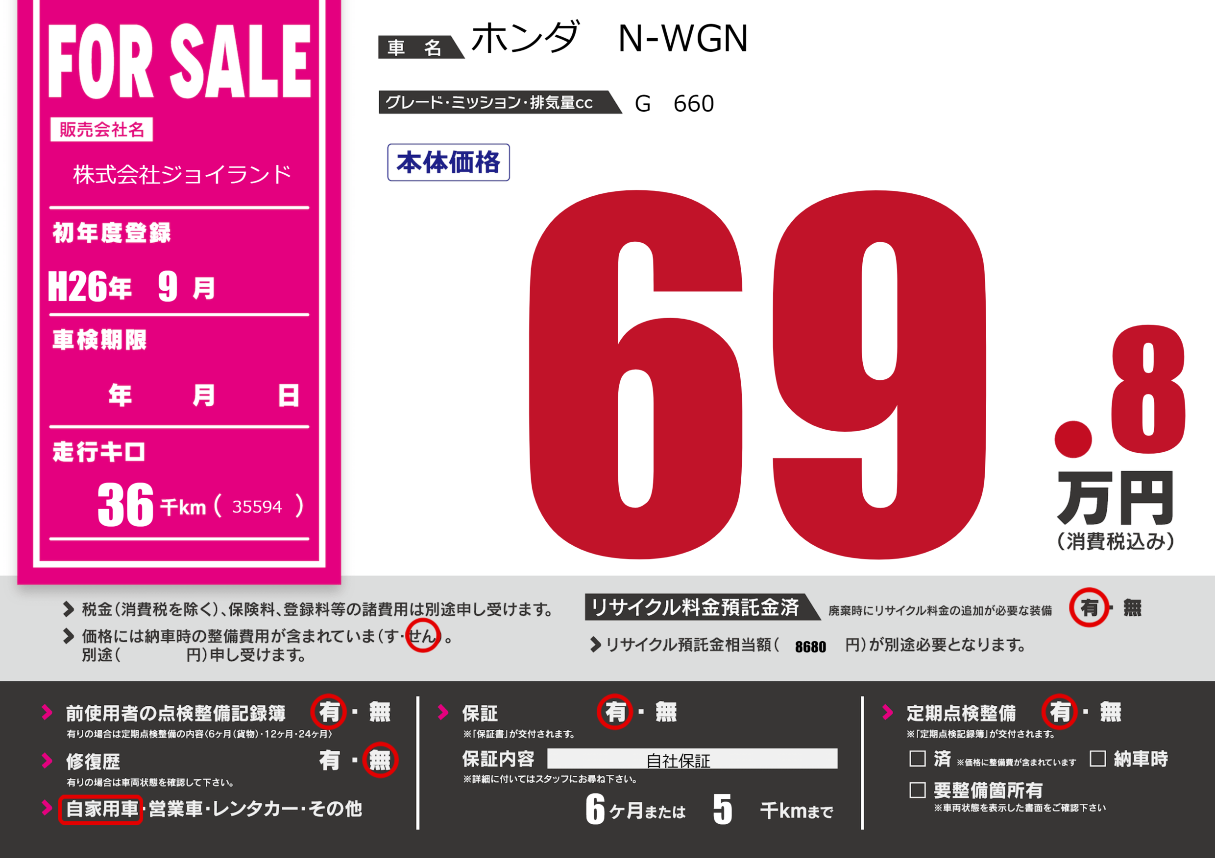 | 車名 | ホンダ N-WGN | グレード ミッション 排気量 |