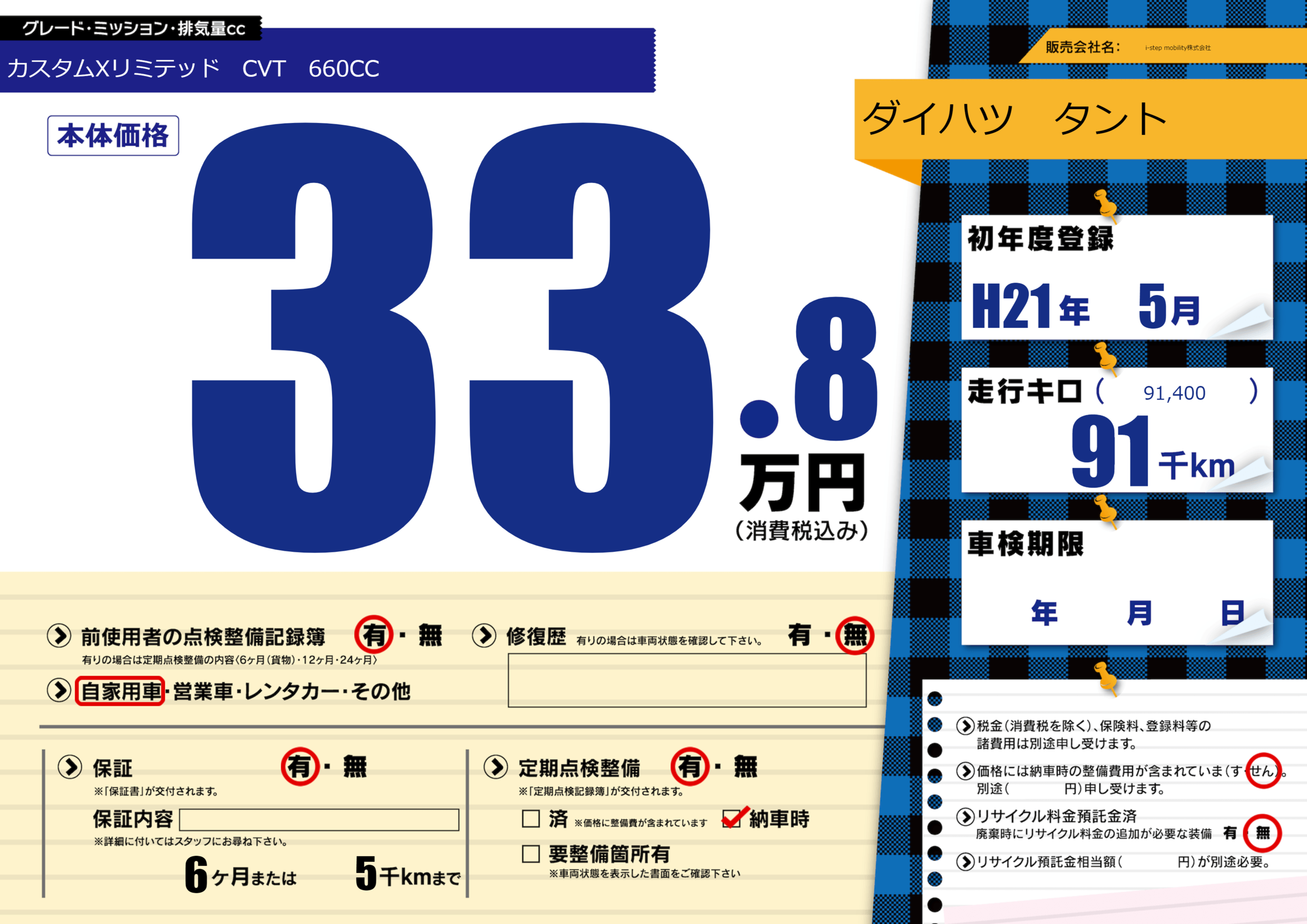 | 車名 | ダイハツ タント | グレード ミッション 排気量 |
