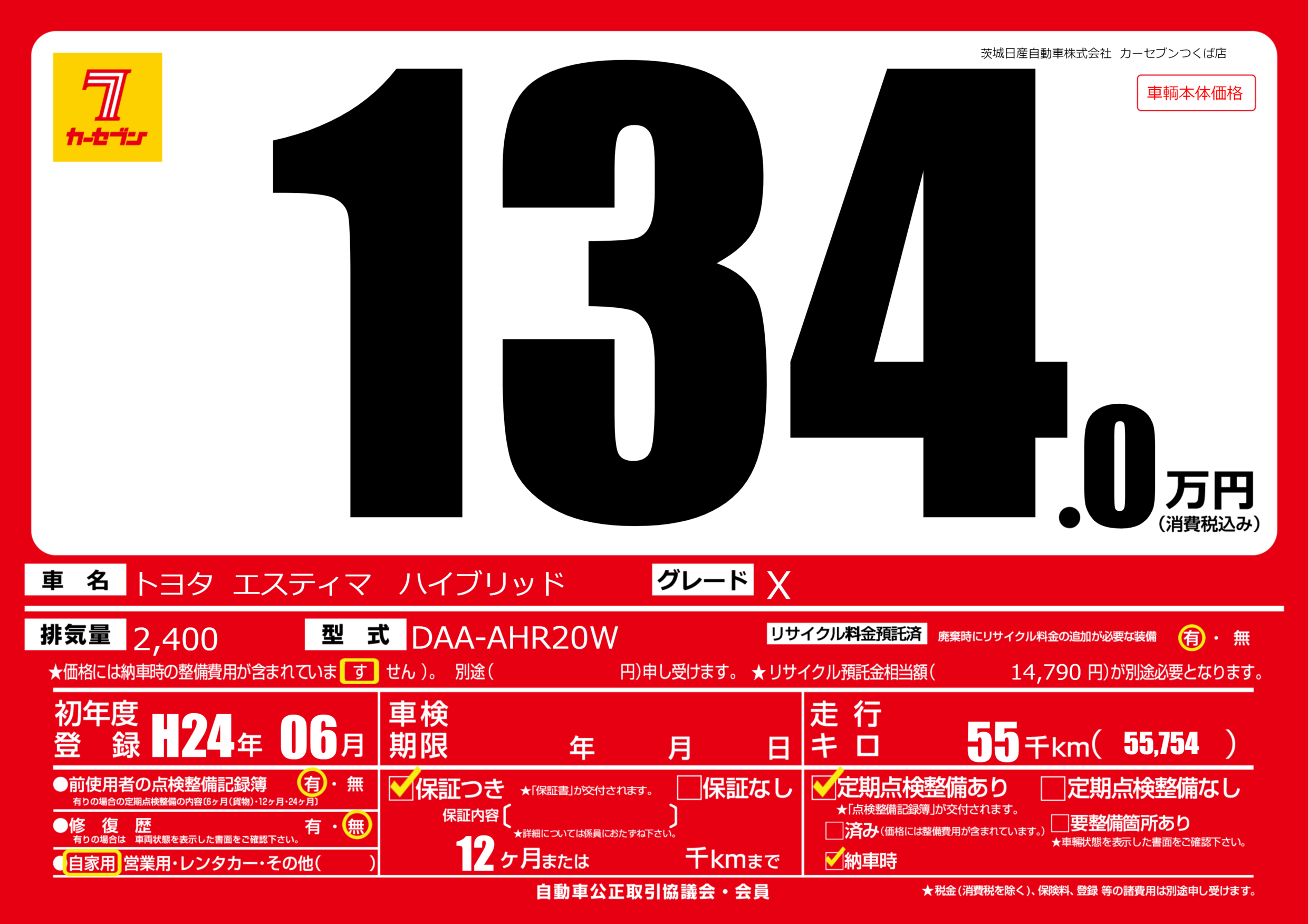 | 車名 | トヨタ エスティマ ハイブリッド | グレード ミッション 排気量 |