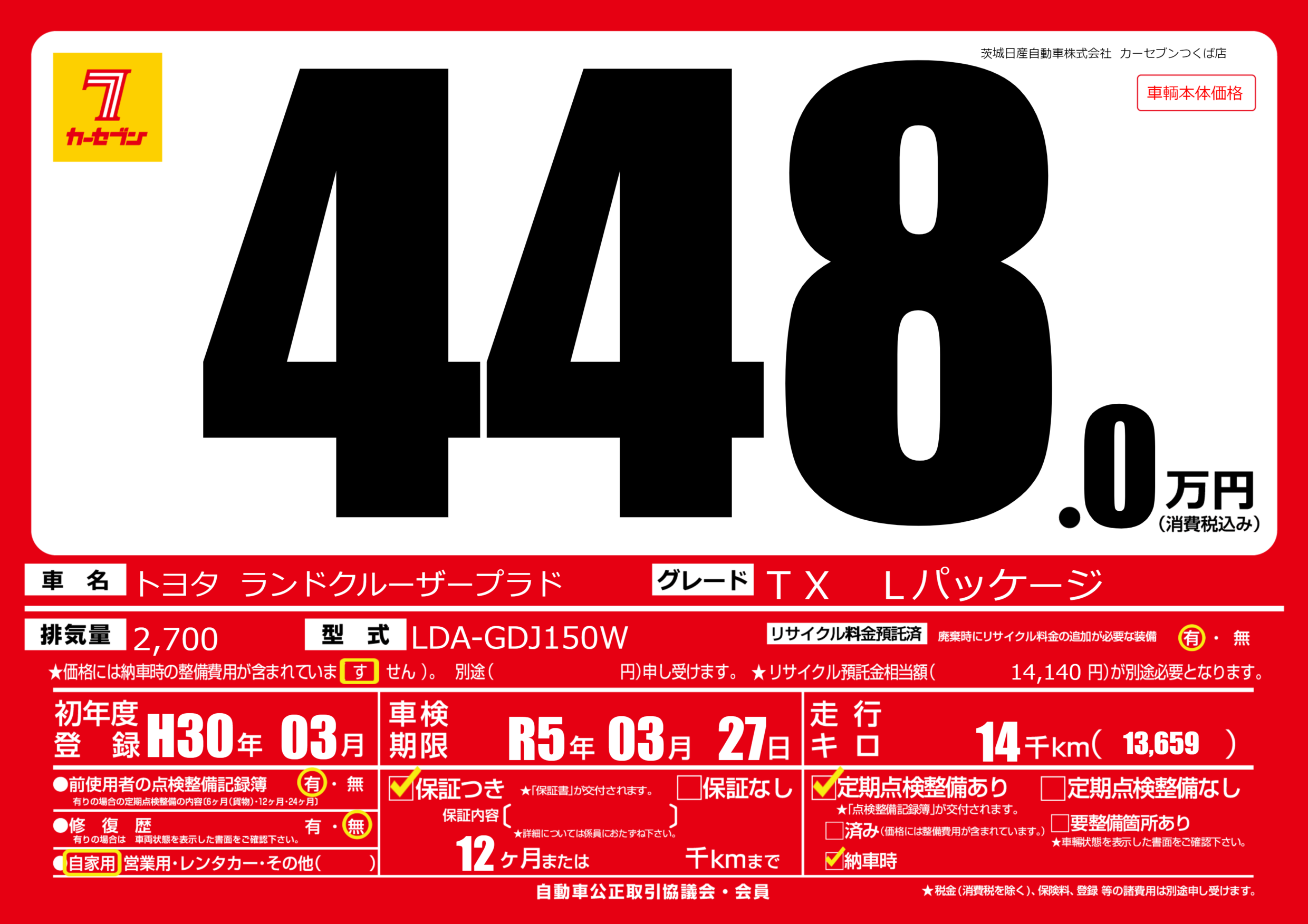 | 定期点検整備 | 定期点検整備あり 納車時あり | ||