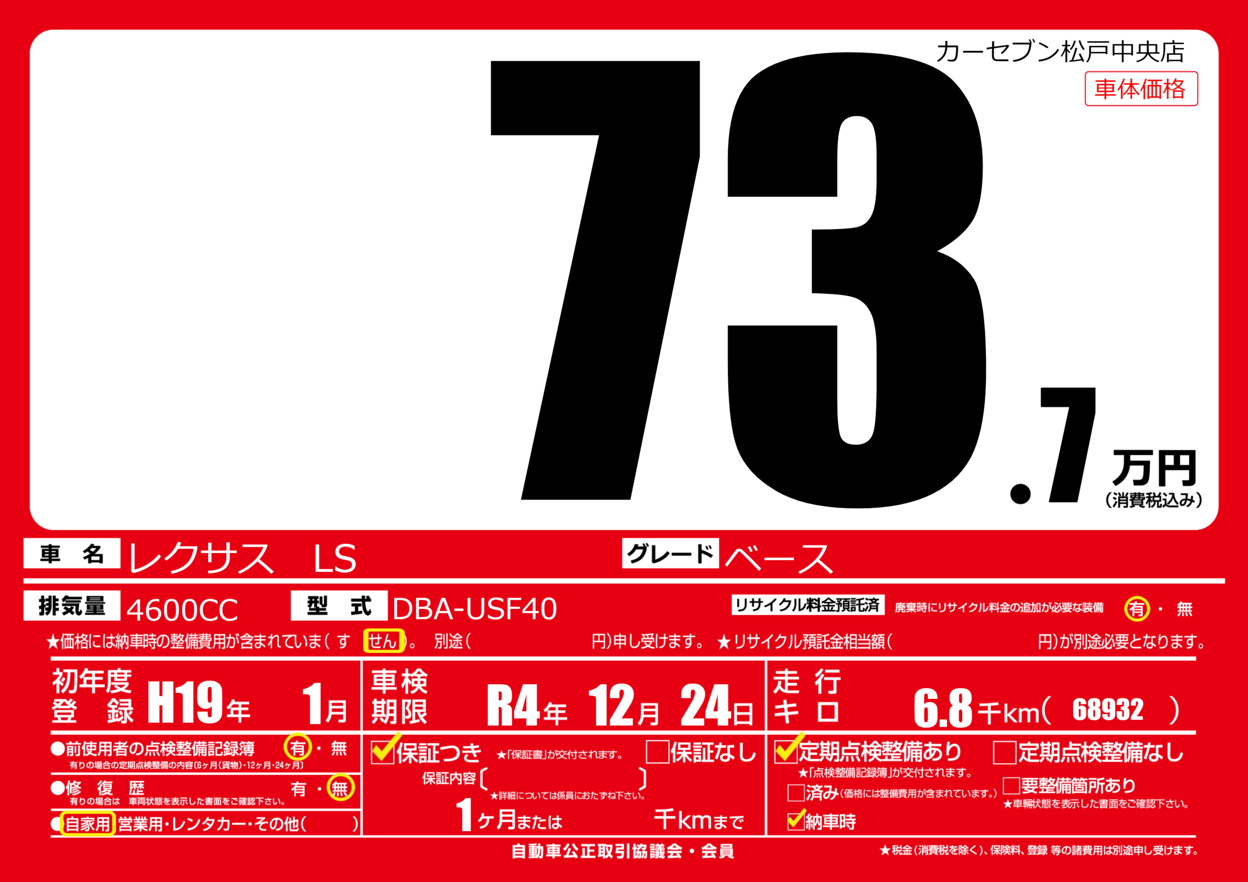 | 定期点検整備 | 定期点検整備あり 納車時あり | ||