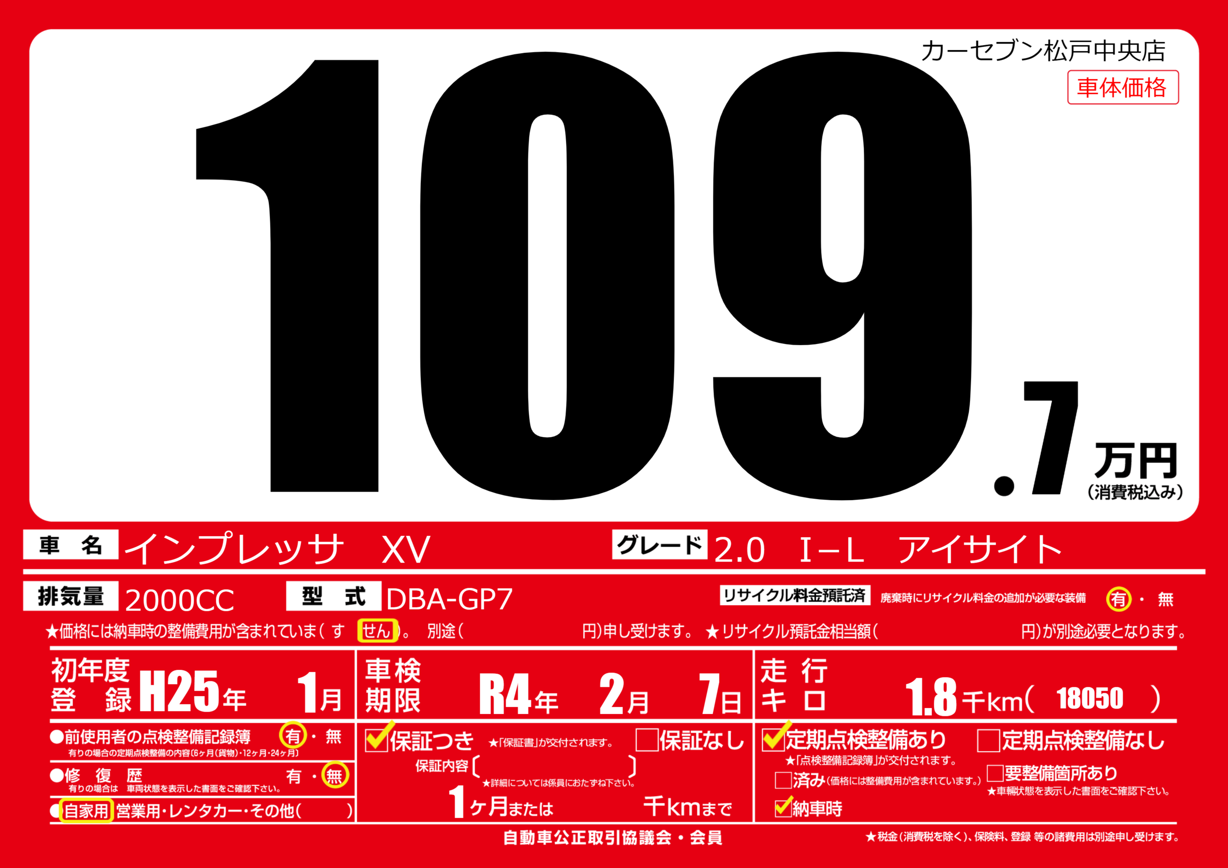 | 車名 | インプレッサ XV | グレード ミッション 排気量 |