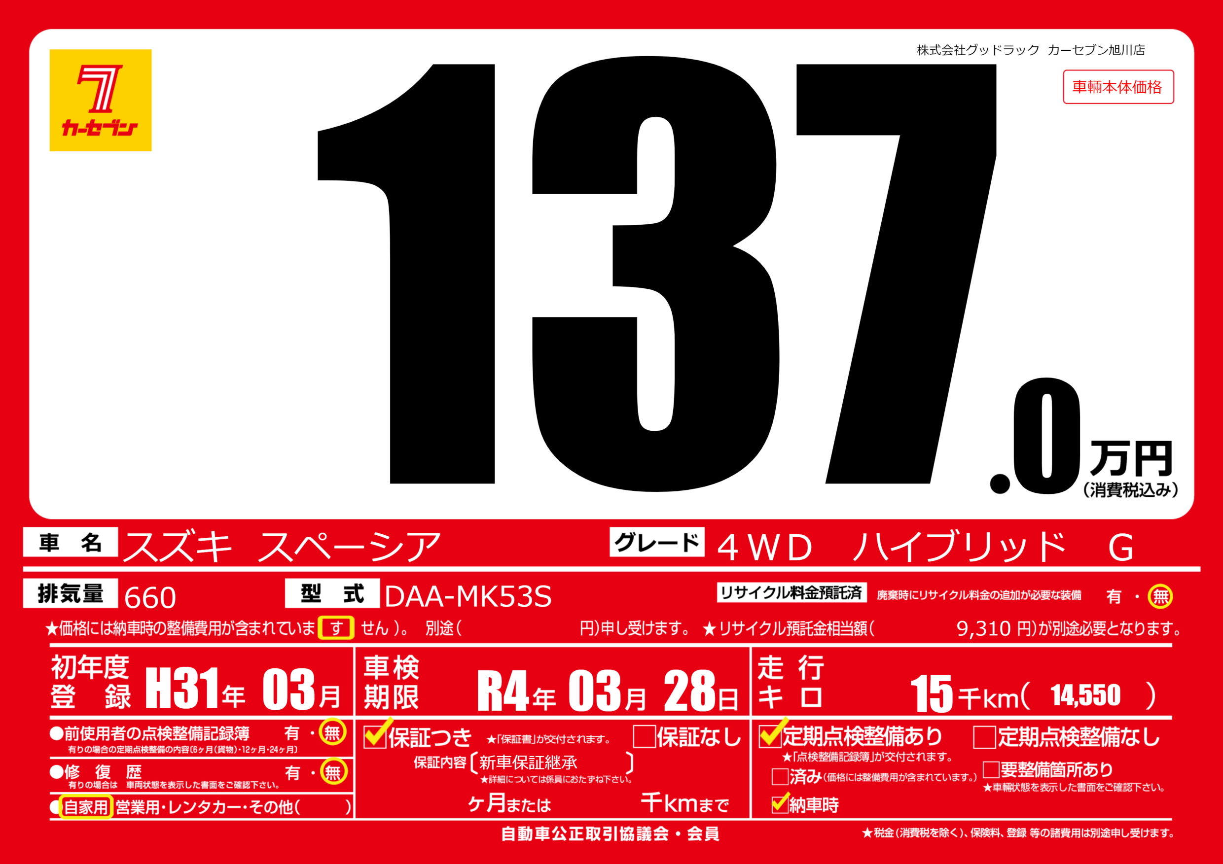 | 走行キロ | 1.5万km | 初年度登録 | H31年03月 |