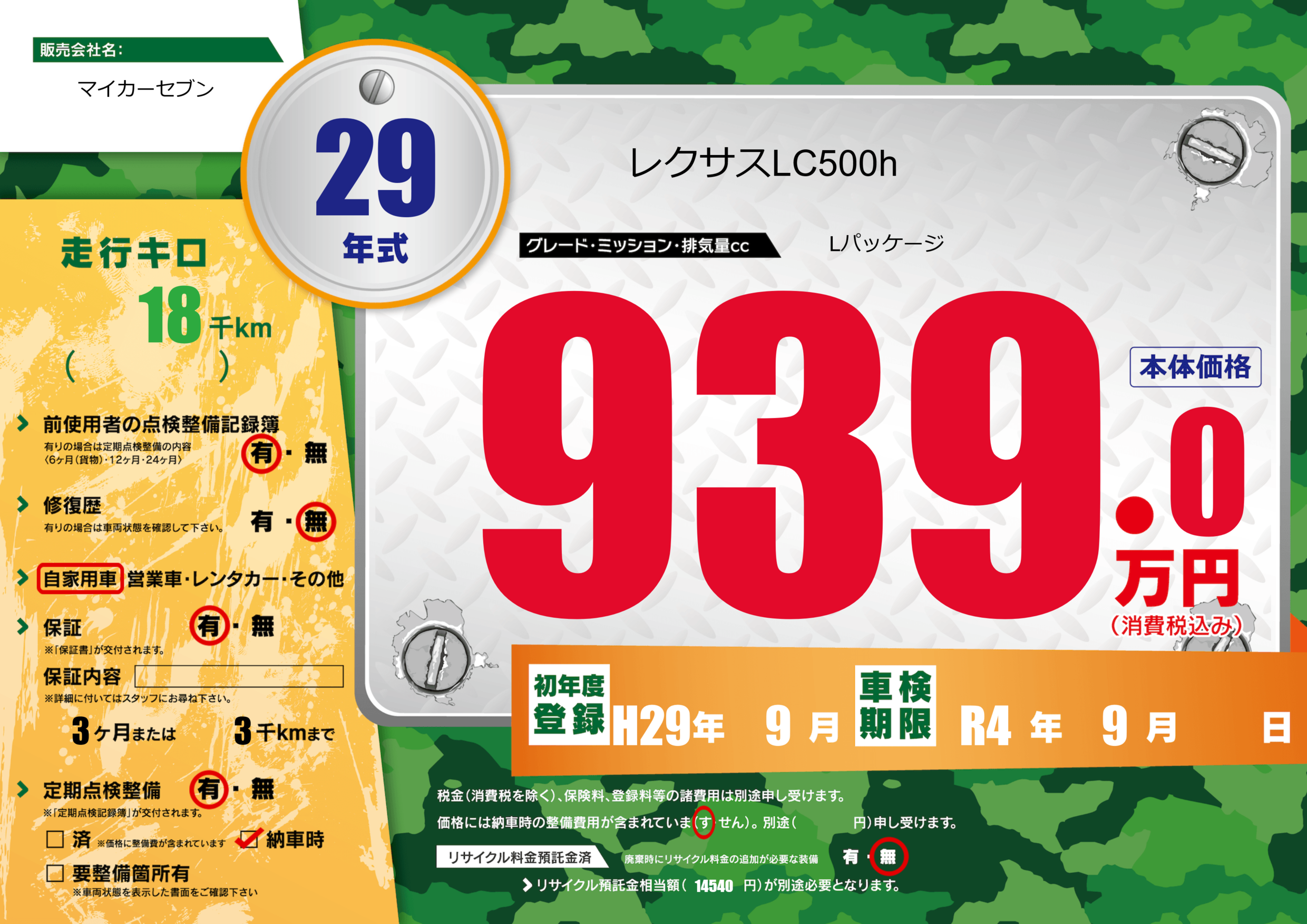 | 車名 | レクサスLC500h | グレード ミッション 排気量 |