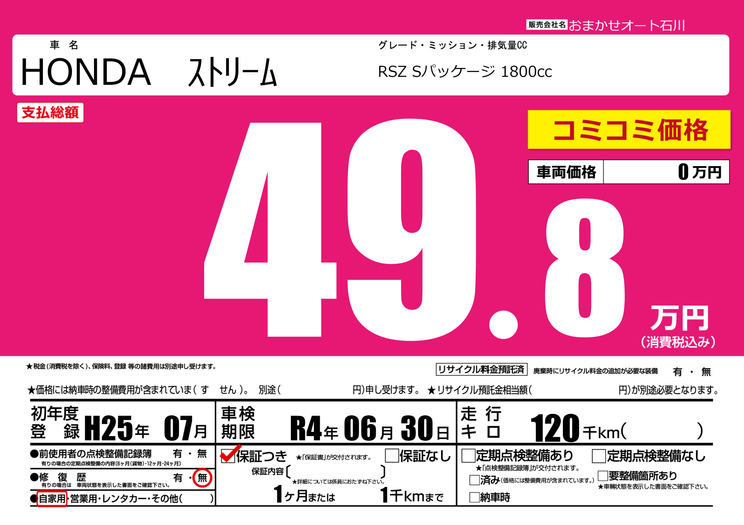 | 車名 | HONDA ストリーム | グレード ミッション 排気量 |