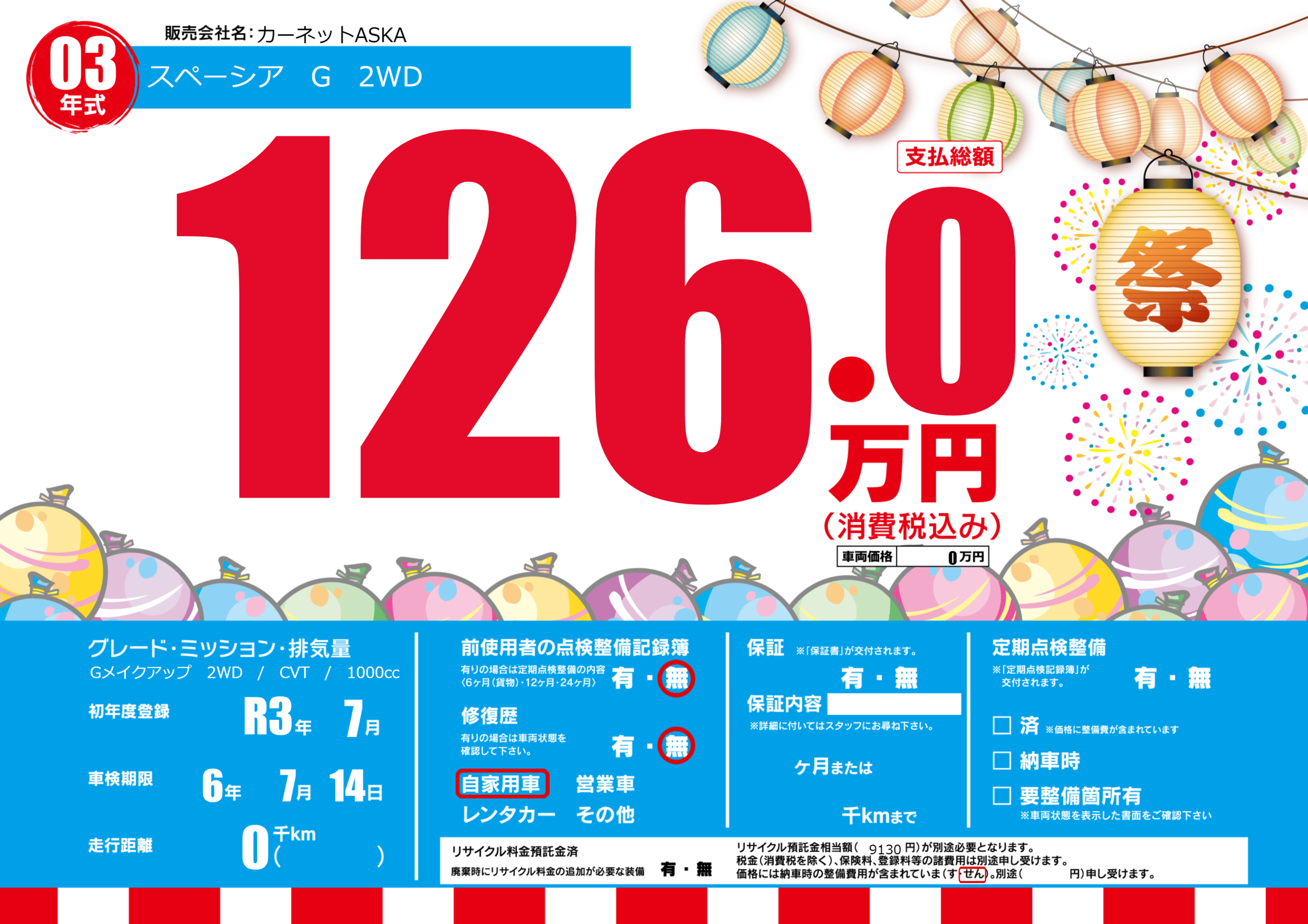 | 車名 | スペーシア G 2WD | グレード ミッション 排気量 |