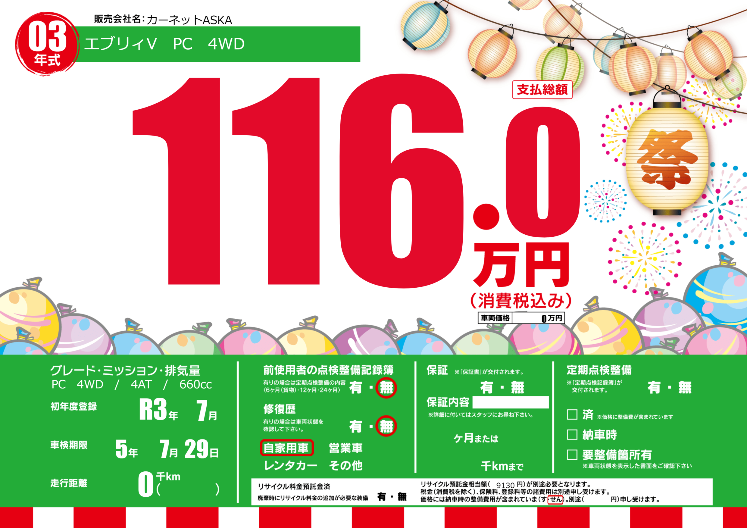 | 車名 | エブリィV PC 4WD | グレード ミッション 排気量 |