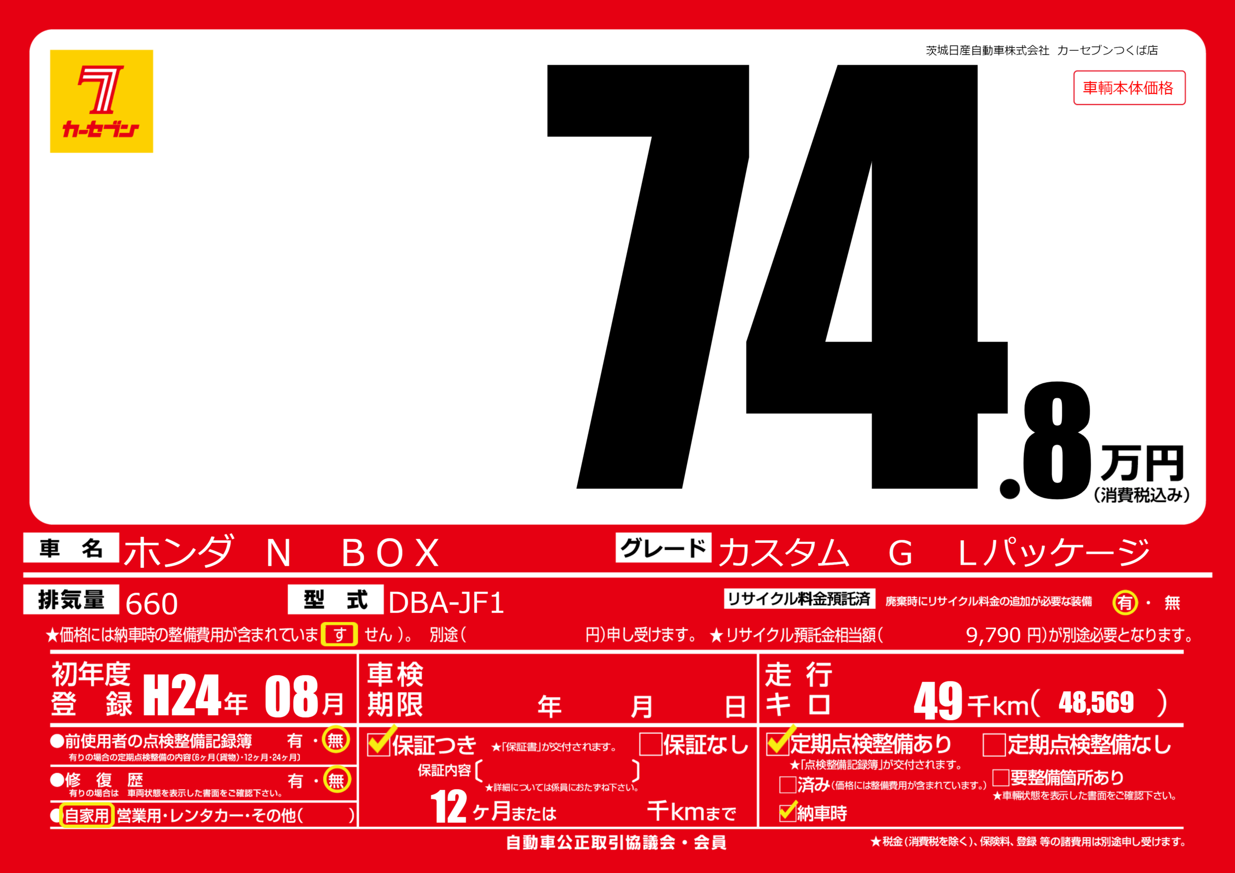 | 走行キロ | 4.9万km | 初年度登録 | H24年08月 |