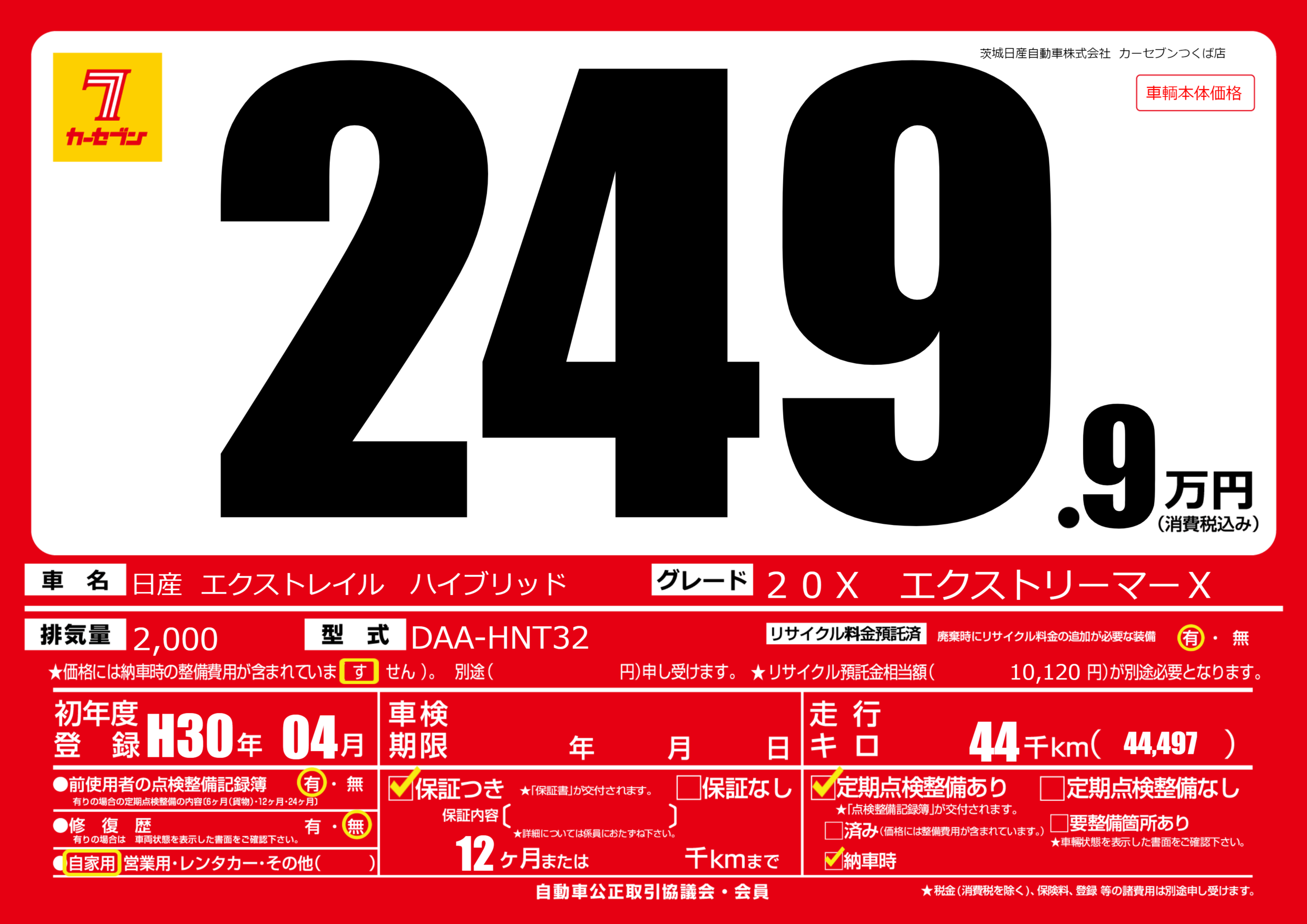 | 車名 | 日産 エクストレイル ハイブリッド | グレード ミッション 排気量 |