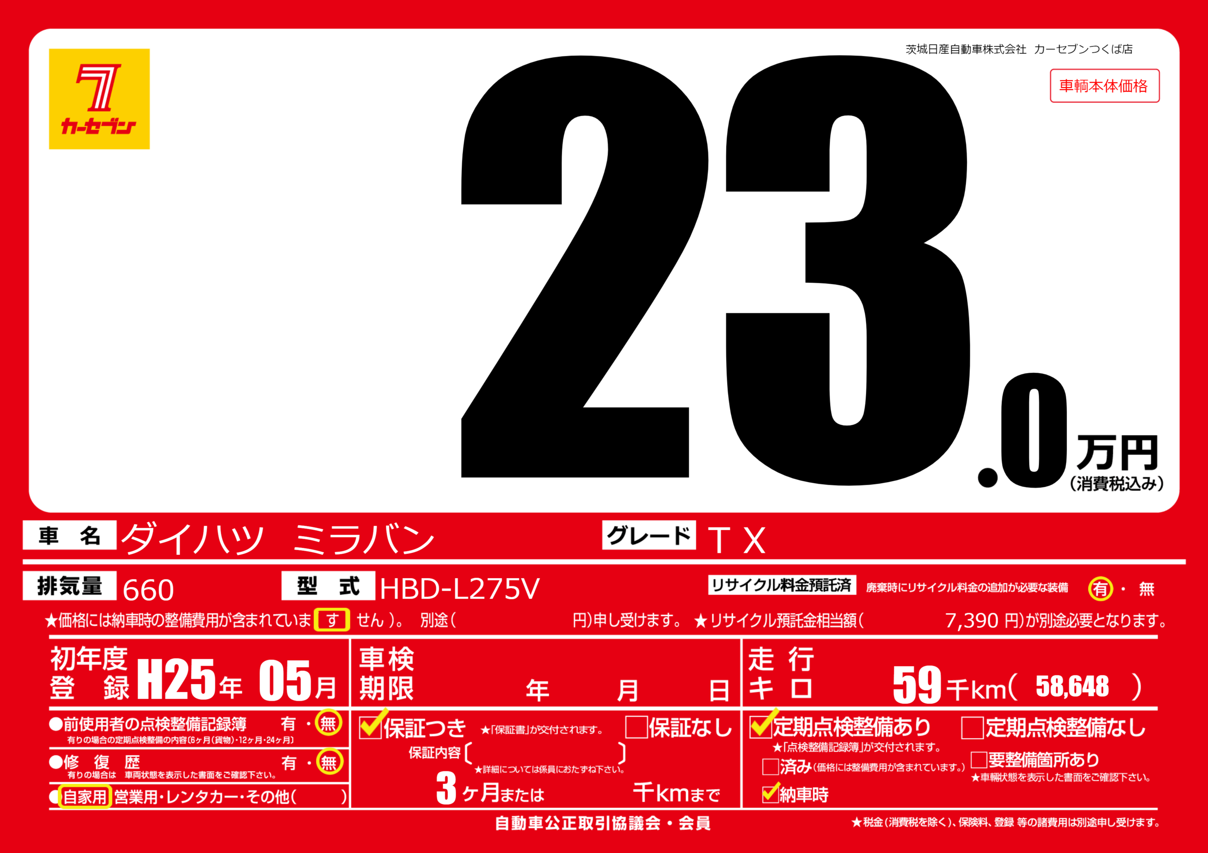 | 車名 | ダイハツ ミラバン | グレード ミッション 排気量 |
