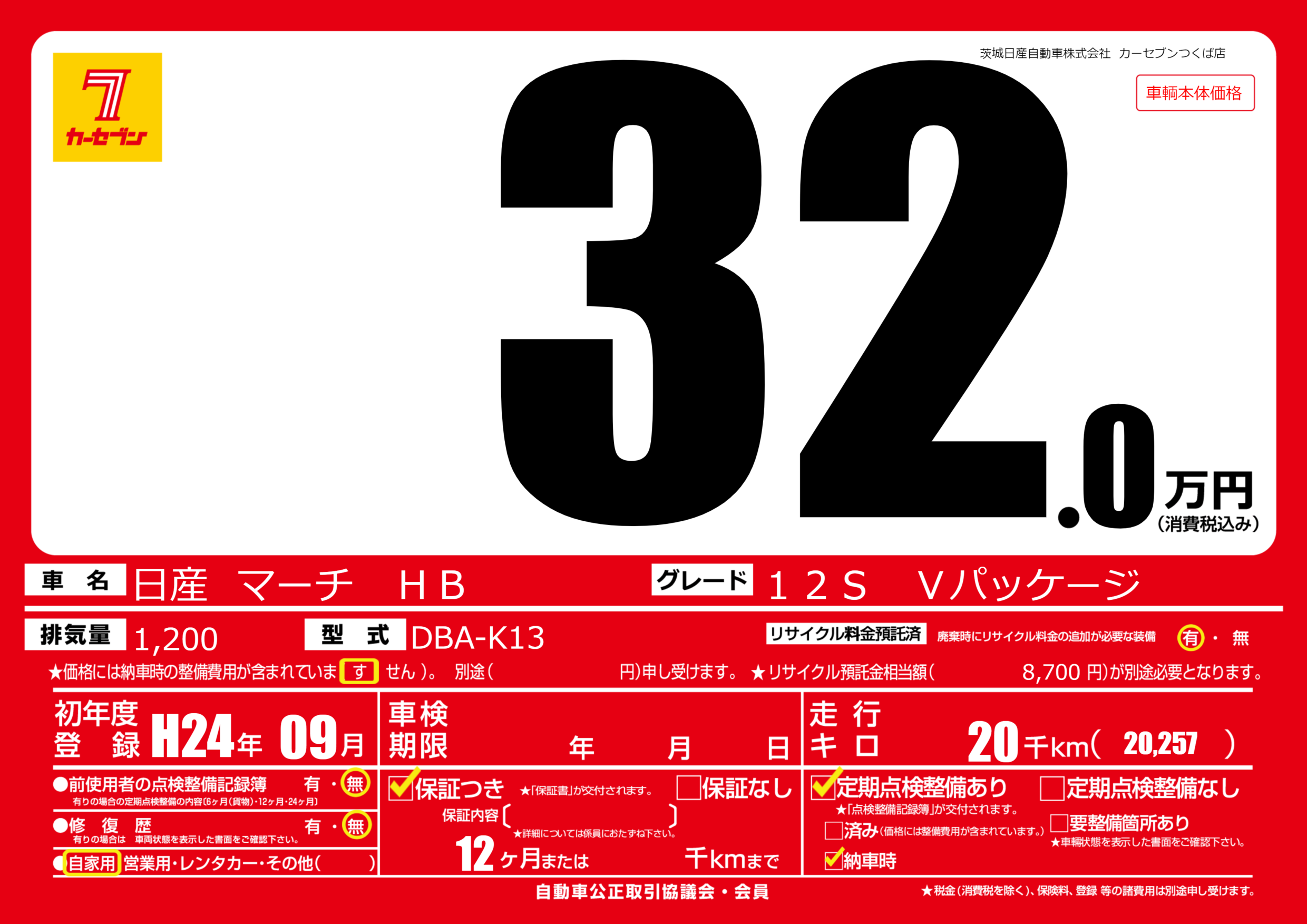 | 車名 | 日産 マーチ HB | グレード ミッション 排気量 |