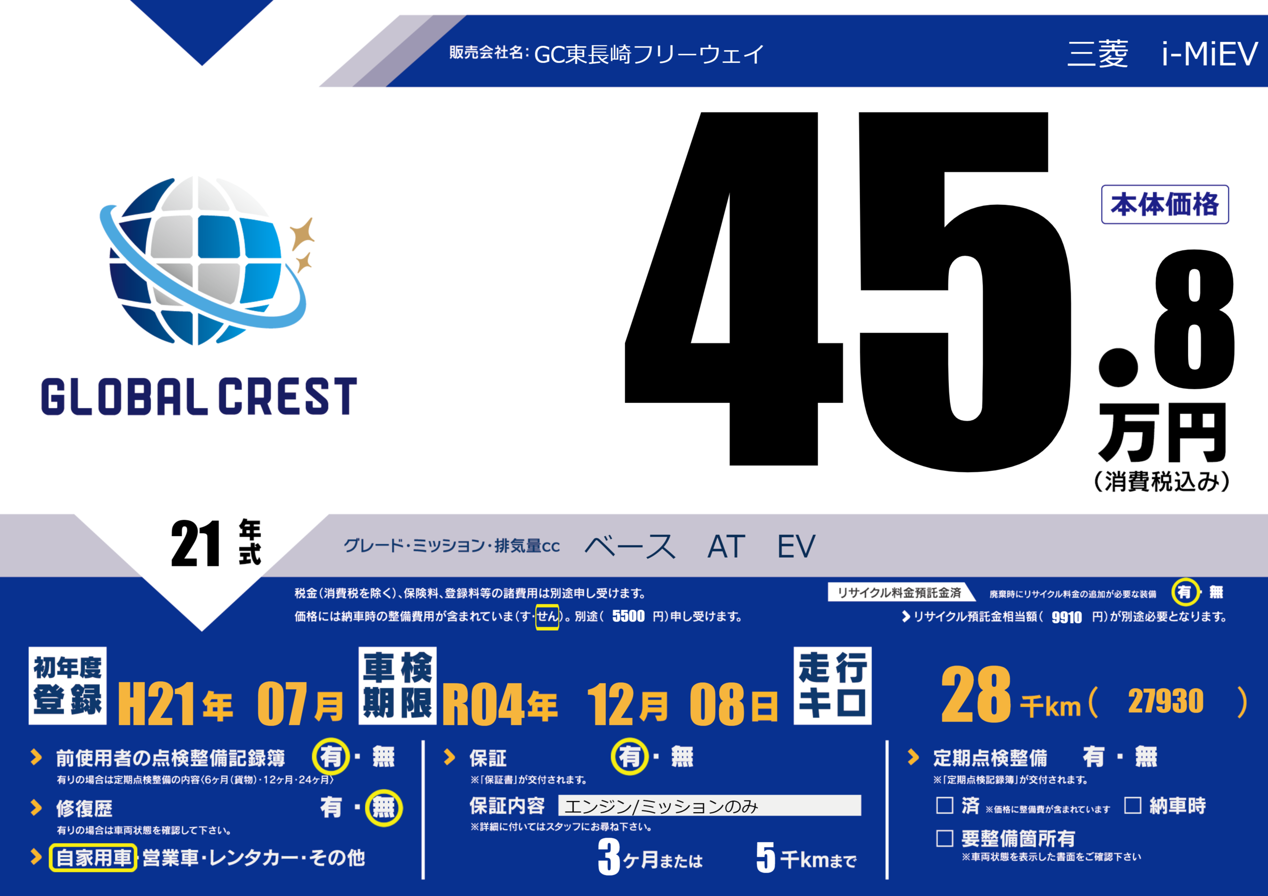 | 車名 | 三菱 i-MiEV | グレード ミッション 排気量 |