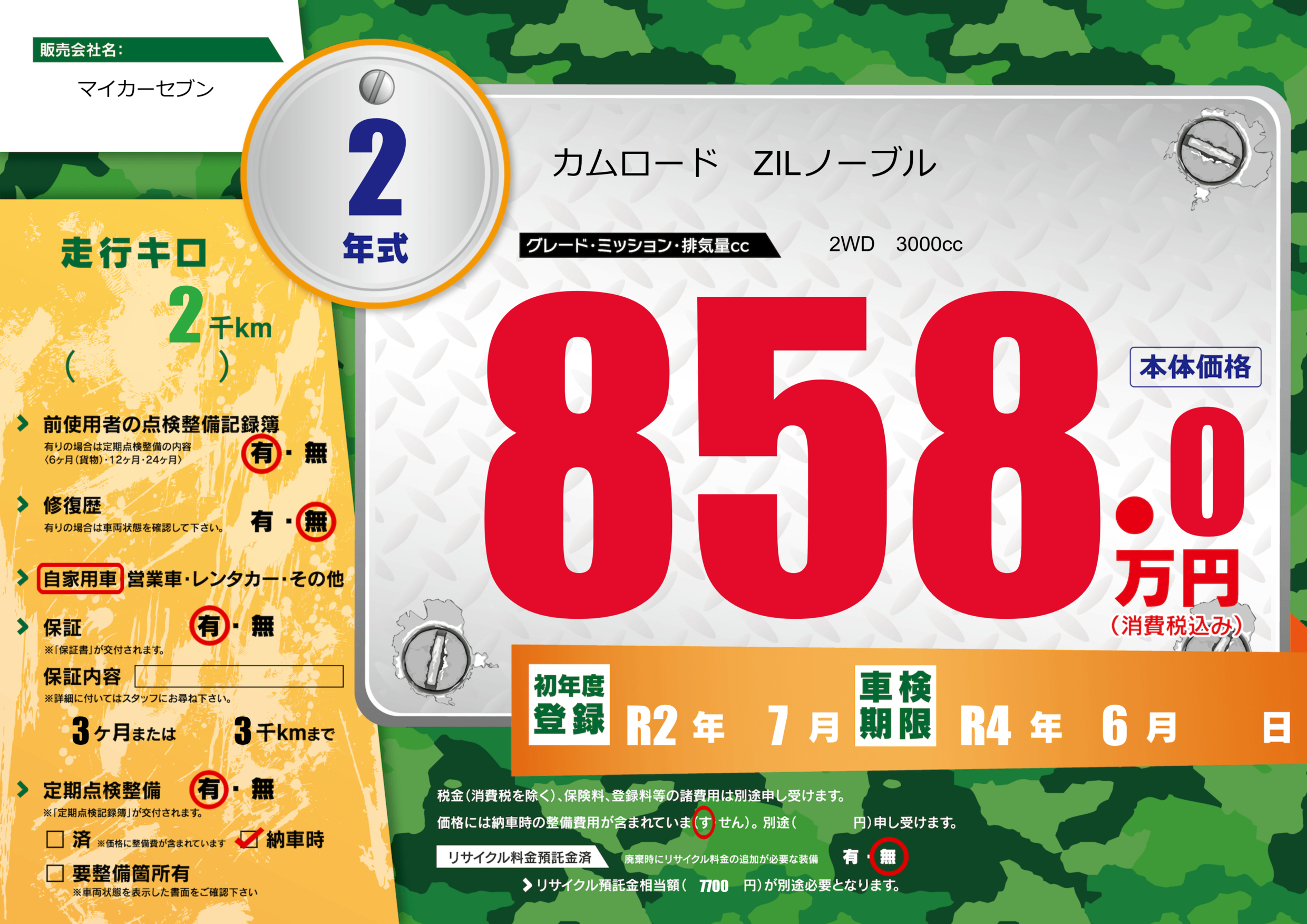 | 走行キロ | 0.2万km | 初年度登録 | R2年7月 |