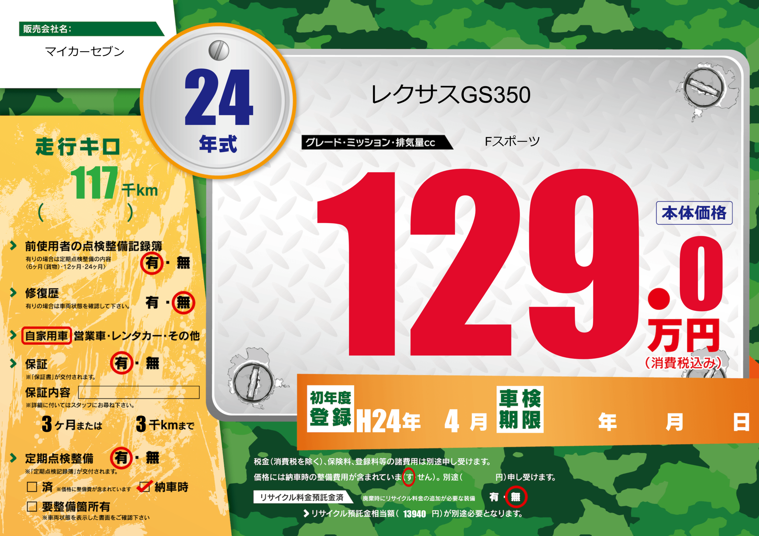 | 車名 | レクサスGS350 | グレード ミッション 排気量 |