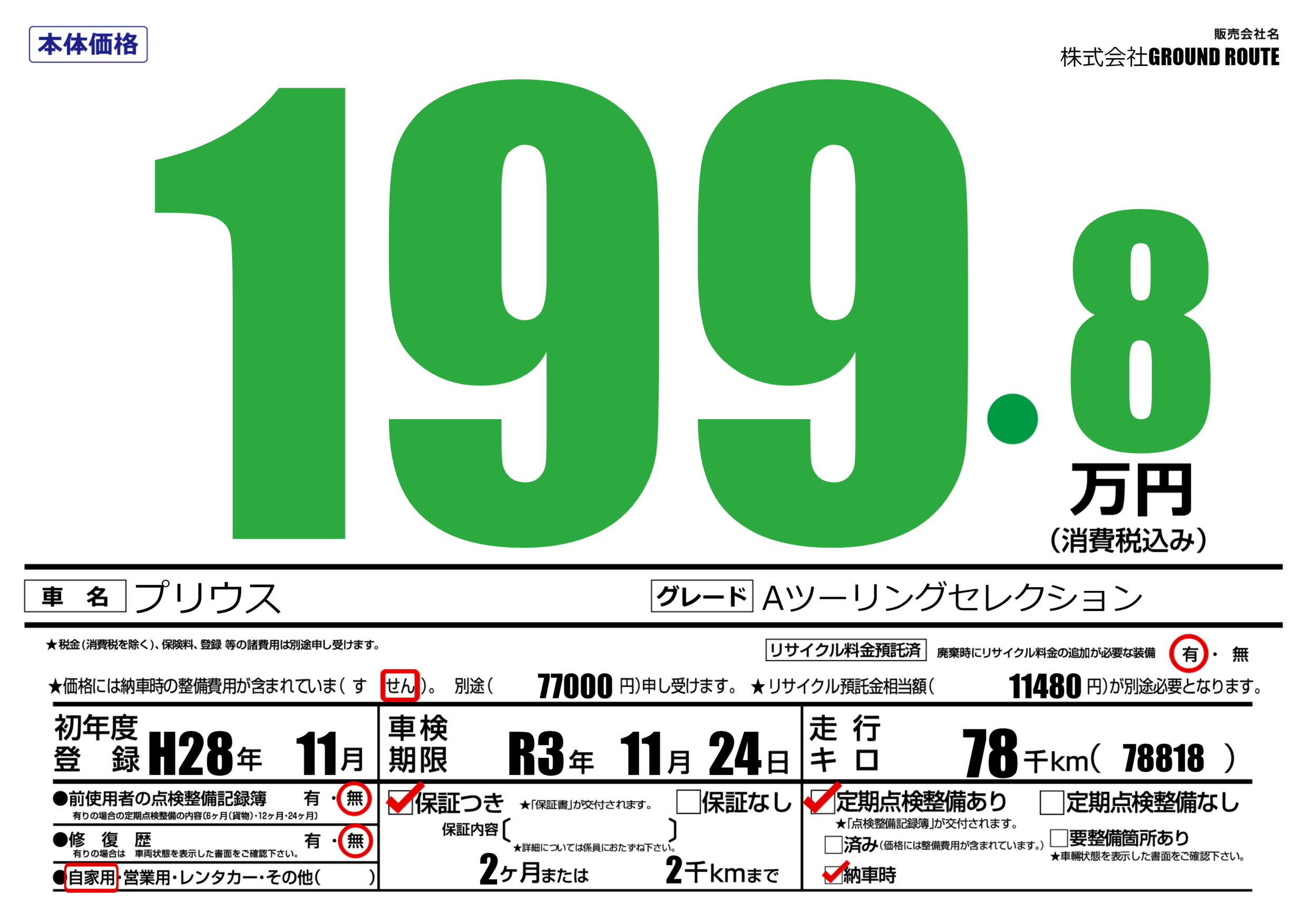 | 車名 | プリウス | グレード ミッション 排気量 |