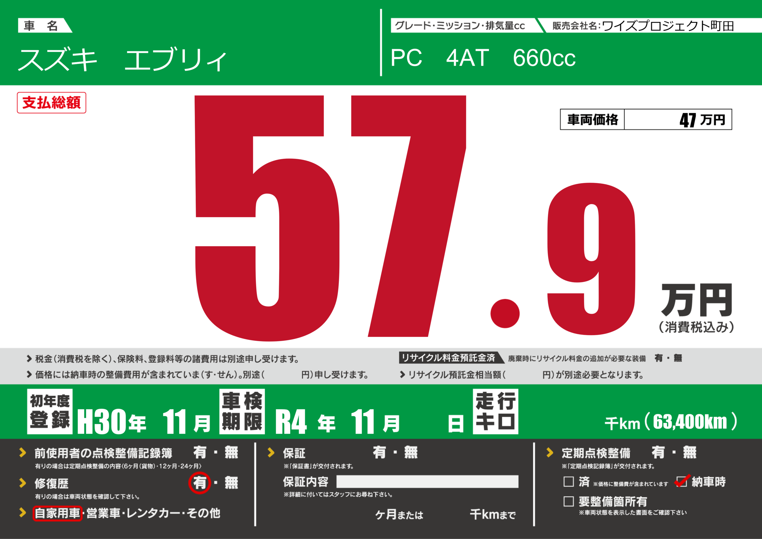 | 車名 | スズキ エブリィ | グレード ミッション 排気量 |