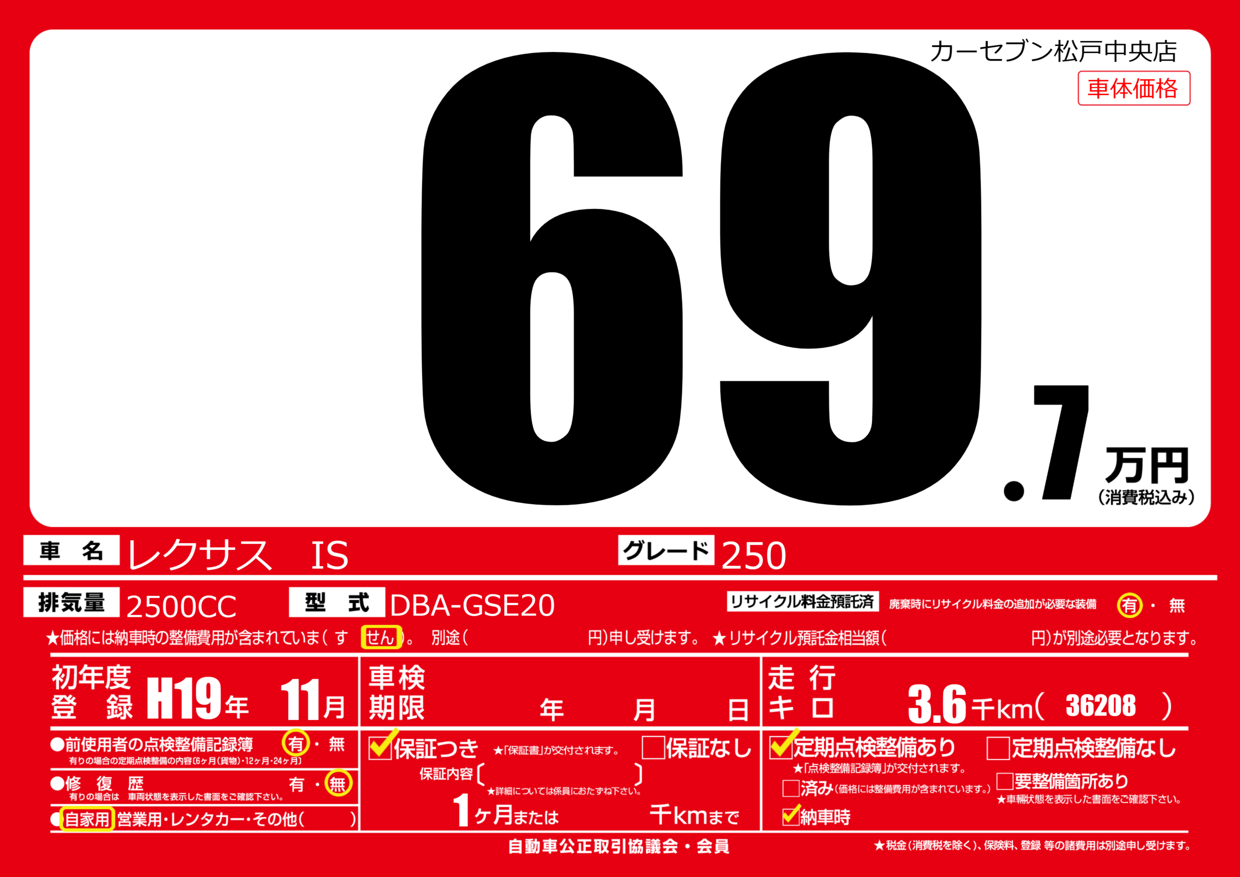 | 車名 | レクサス IS | グレード ミッション 排気量 |
