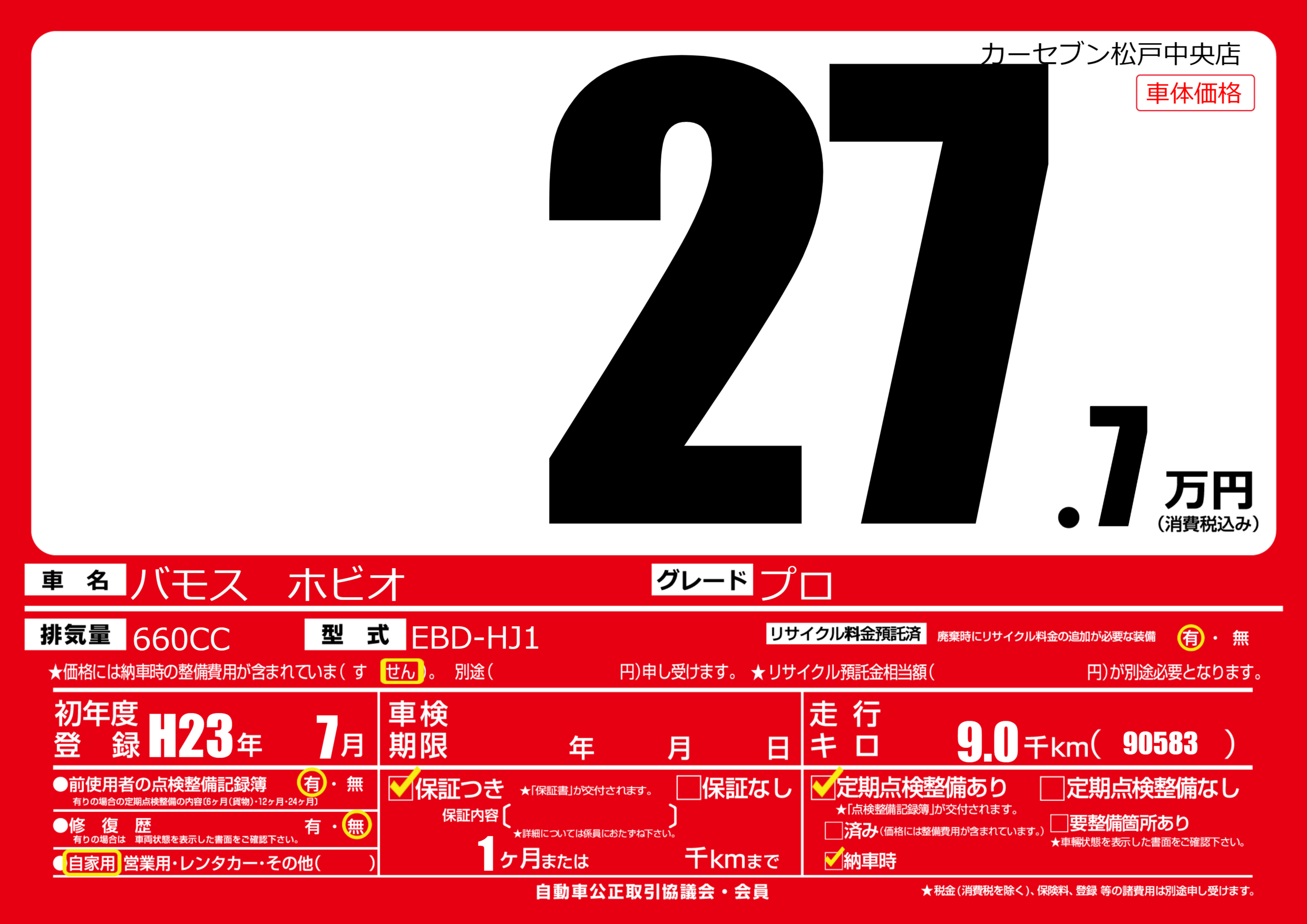 | 走行キロ | 0.9万km | 初年度登録 | H23年7月 |