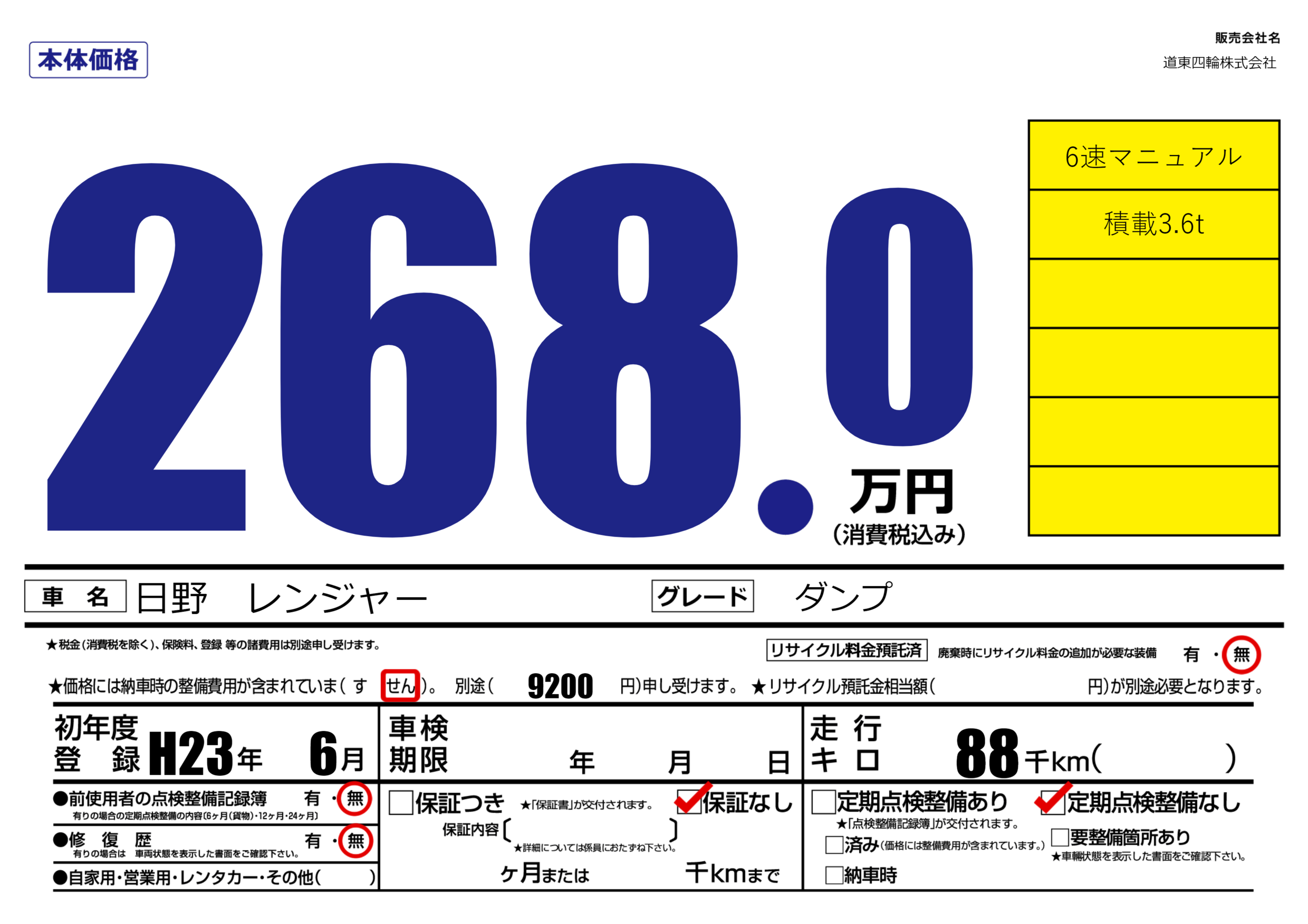 | 車名 | 日野 レンジャー | グレード ミッション 排気量 |