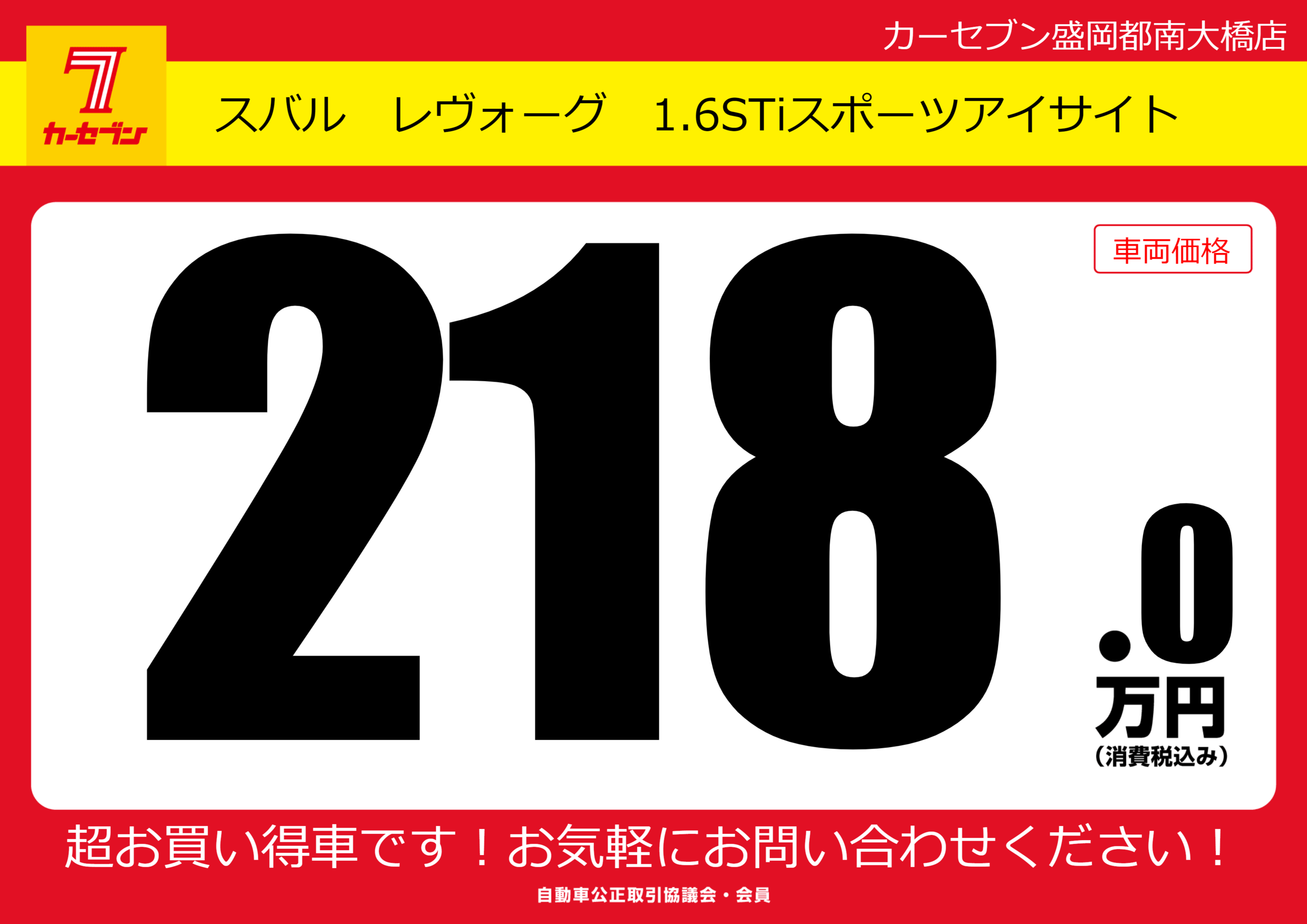 | 車名 | スバル レヴォーグ 1.6STiスポーツアイサイト | グレード ミッション 排気量 |