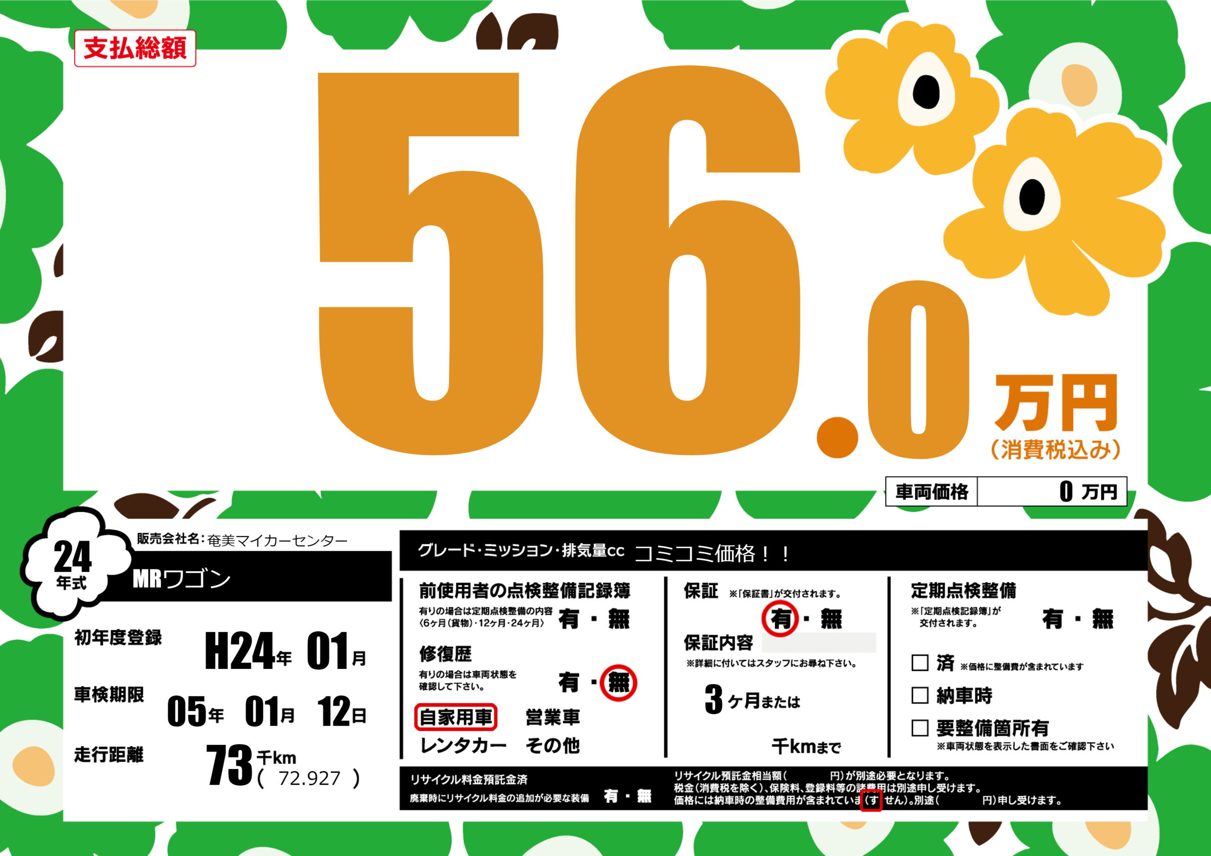 | 車名 | MRワゴン | グレード ミッション 排気量 |