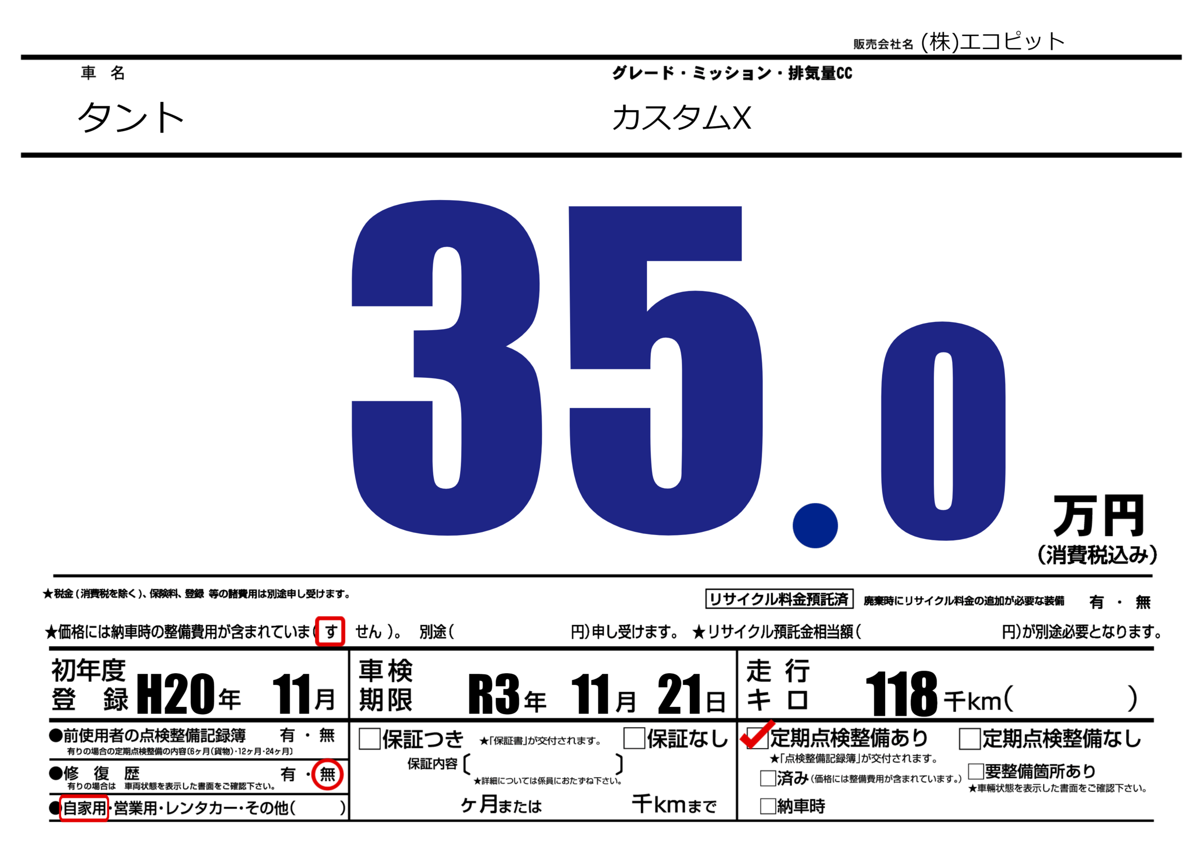 | 走行キロ | 11.8万km | 初年度登録 | H20年11月 |