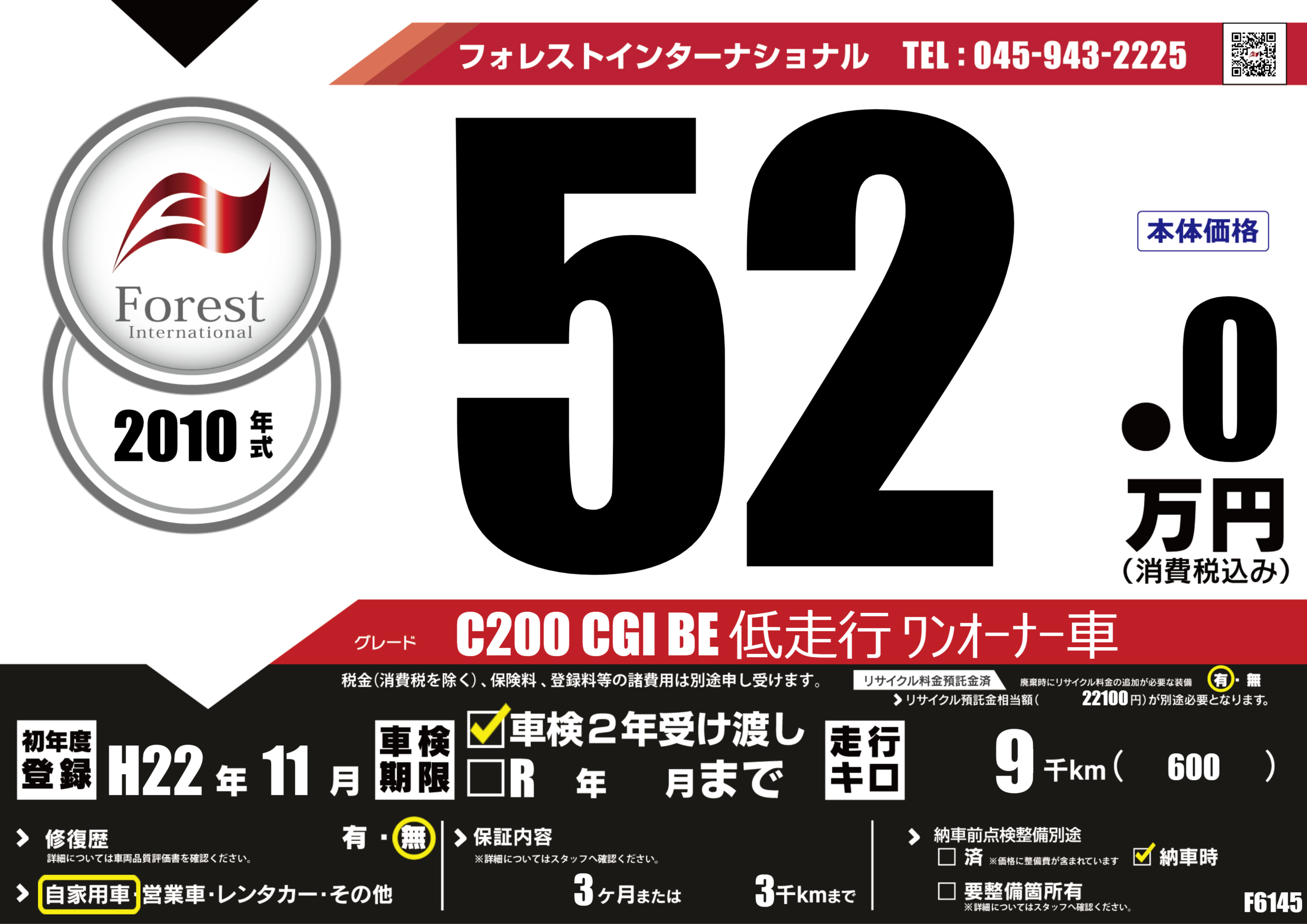 | 走行キロ | 0.9万km | 初年度登録 | H22年11月 |
