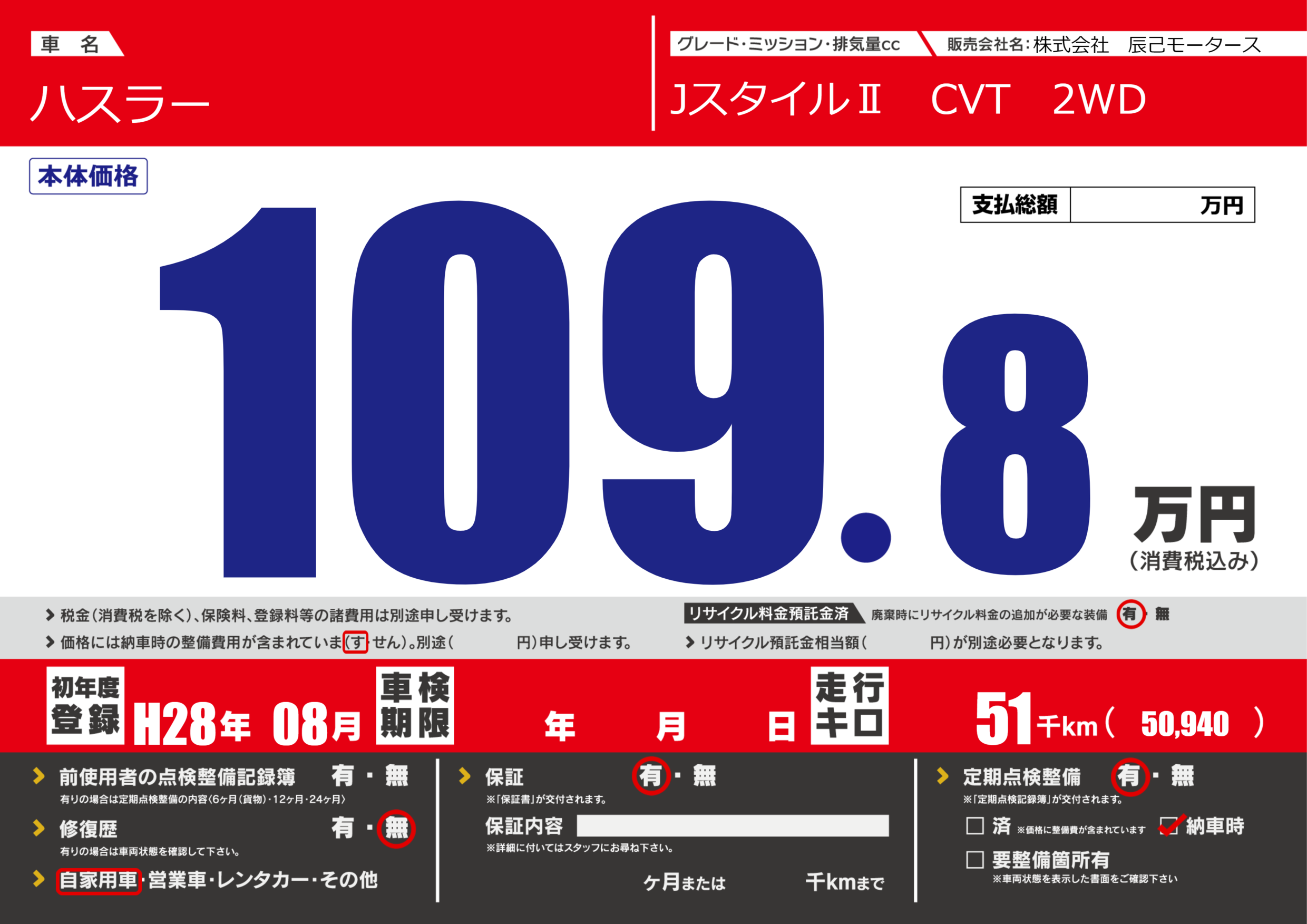 | 車名 | ハスラー | グレード ミッション 排気量 |