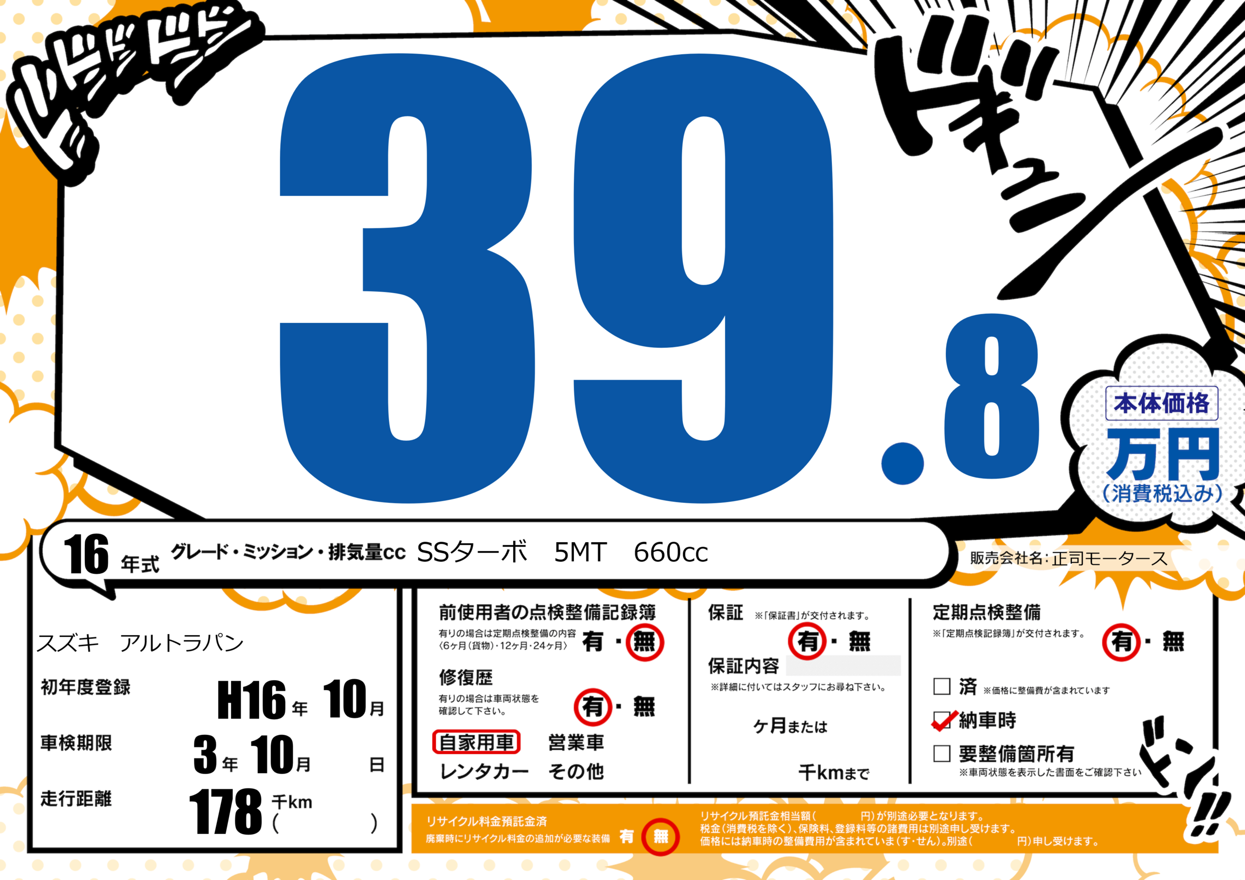 | 走行キロ | 17.8万km | 初年度登録 | H16年10月 |