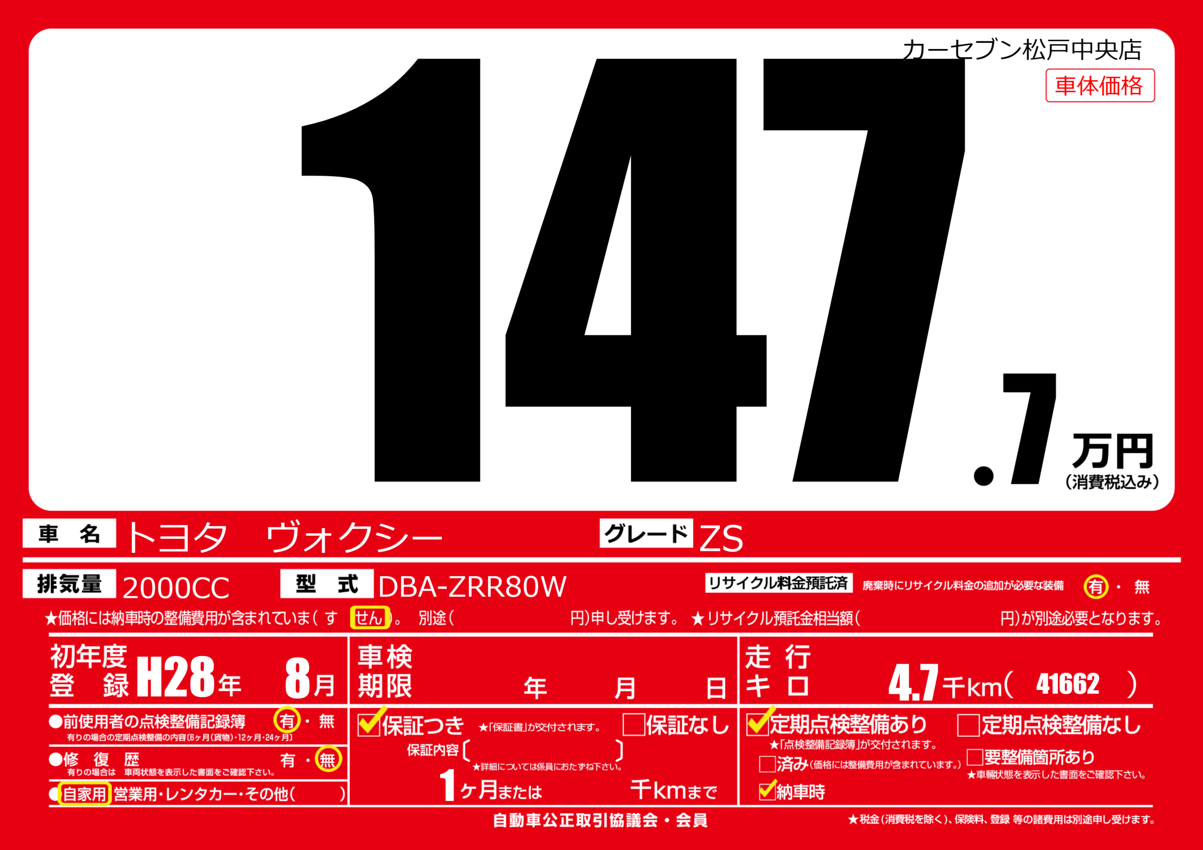 | 車名 | トヨタ ヴォクシー | グレード ミッション 排気量 |