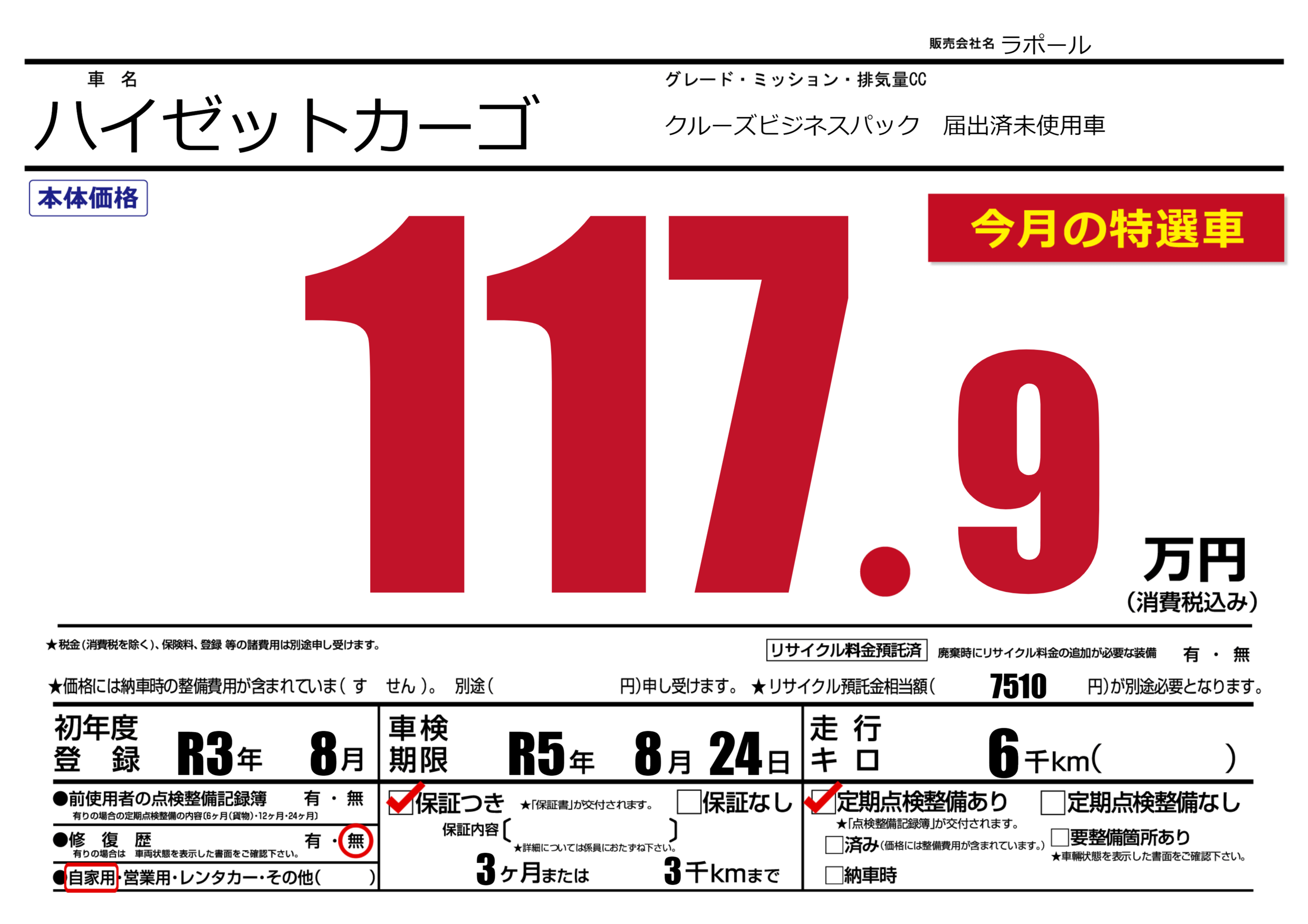 | 走行キロ | 0.6万km | 初年度登録 | R3年8月 |