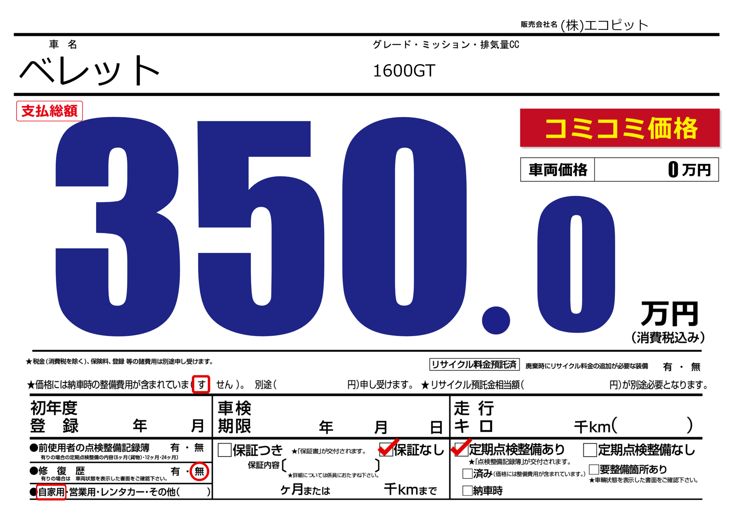 | 車検制限 | - 年 - 月 - 日 | ||