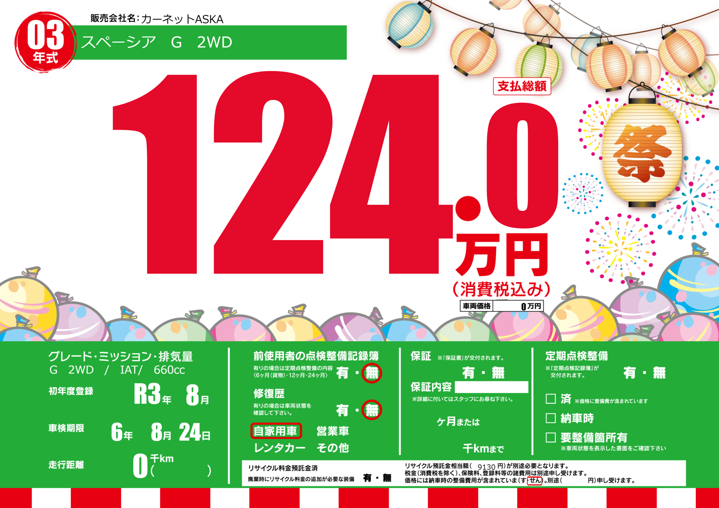 | 車名 | スペーシア G 2WD | グレード ミッション 排気量 |