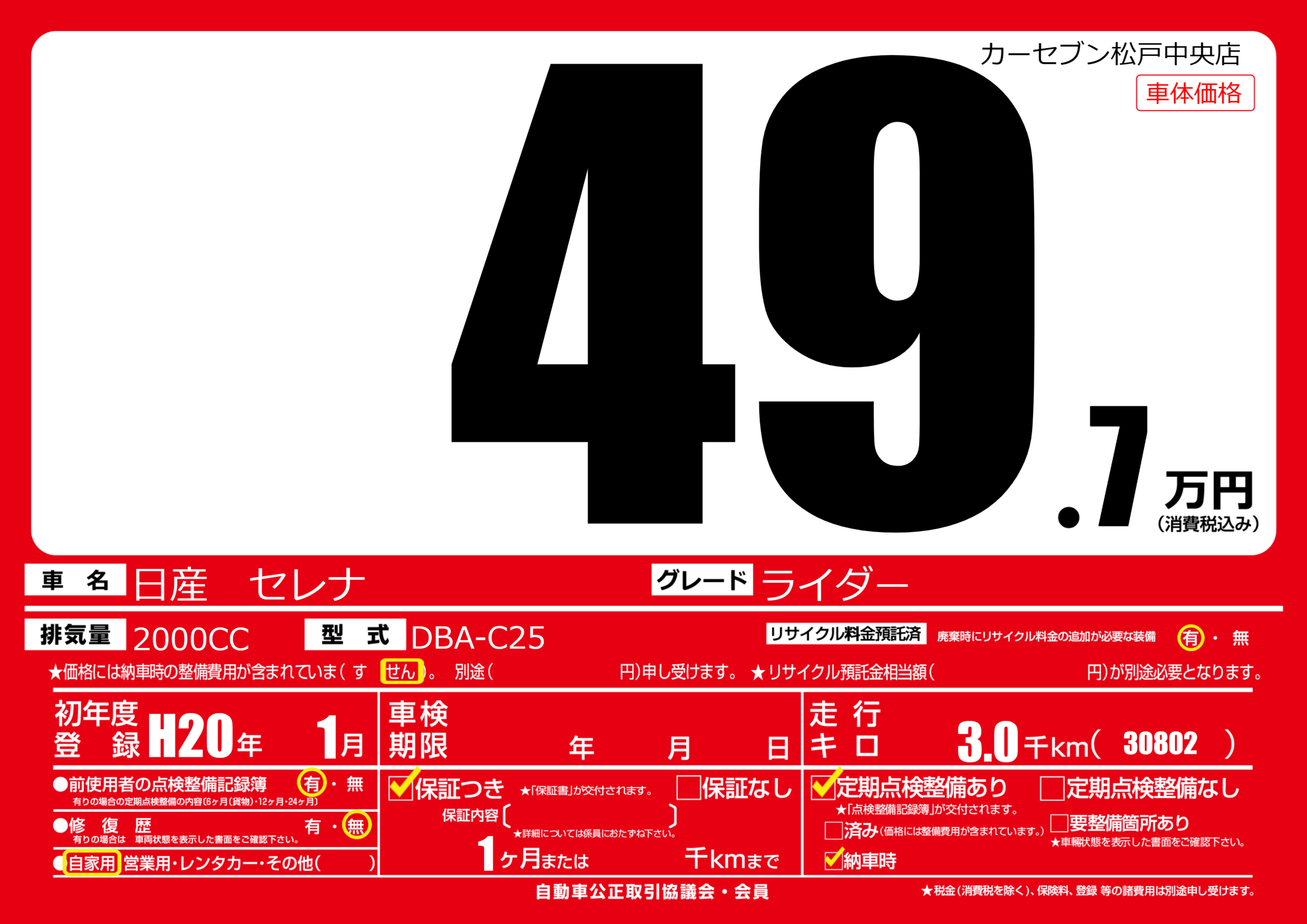 | 車名 | 日産 セレナ | グレード ミッション 排気量 |