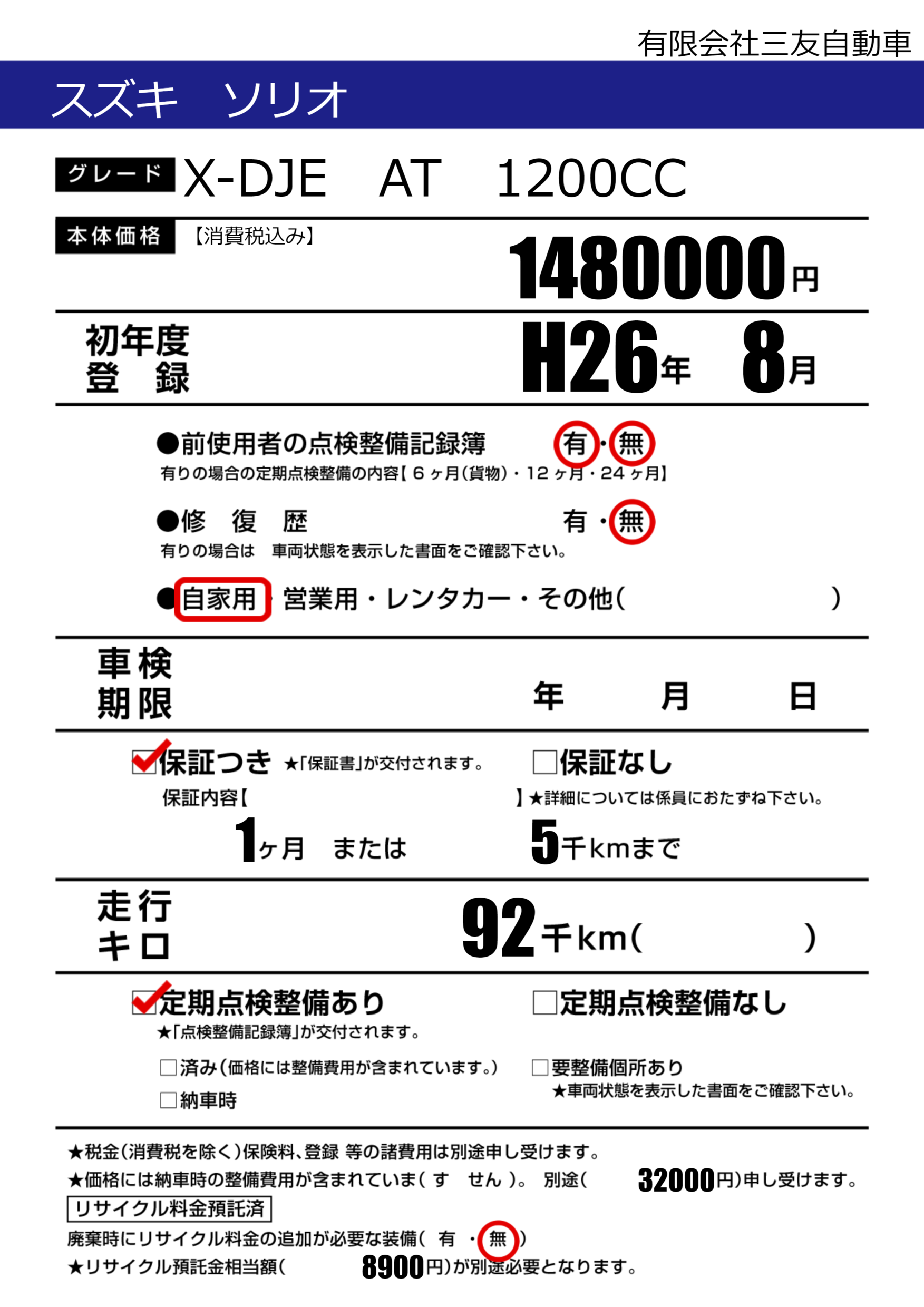 | 車名 | スズキ ソリオ | グレード ミッション 排気量 |