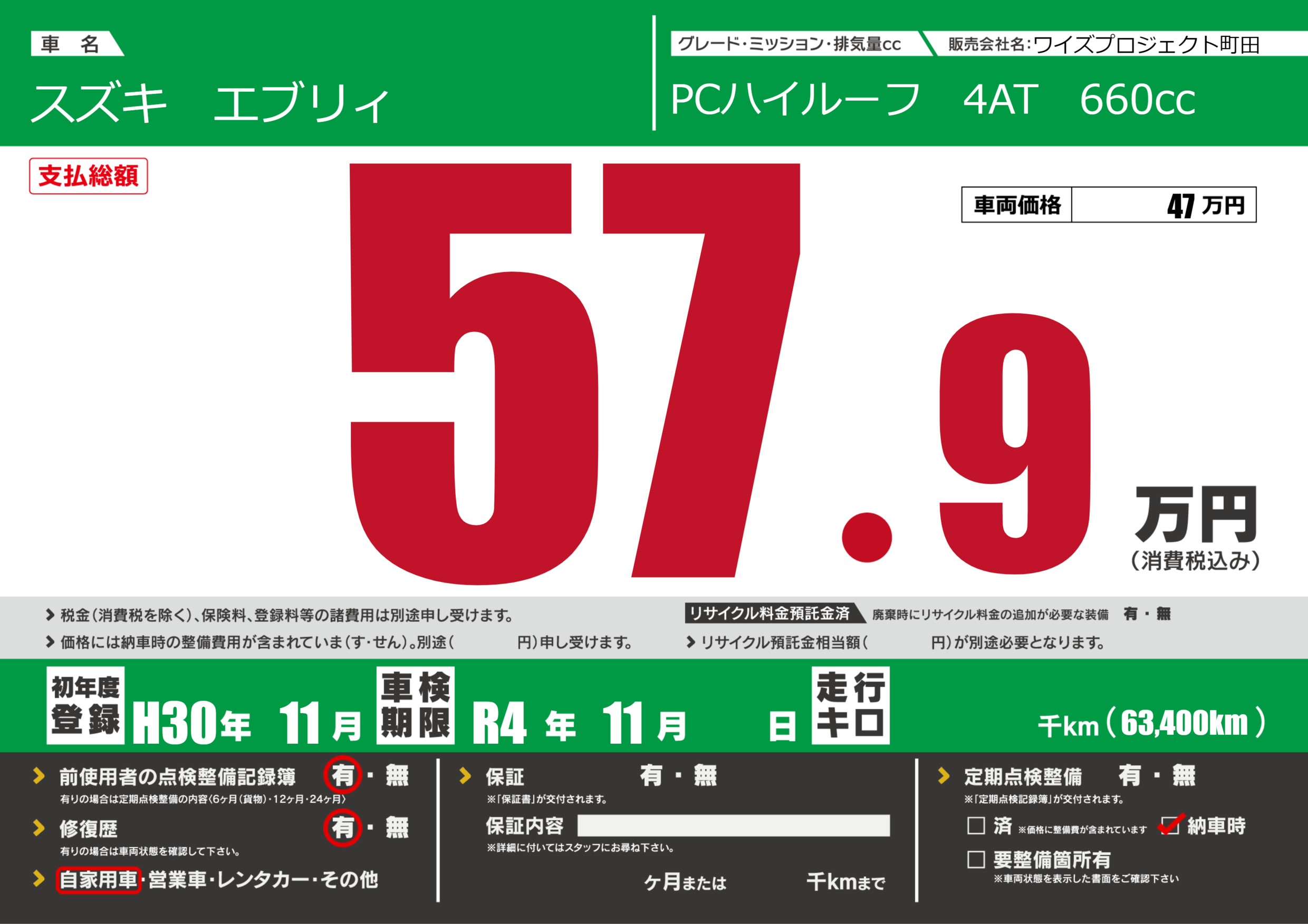 | 車名 | スズキ エブリィ | グレード ミッション 排気量 |