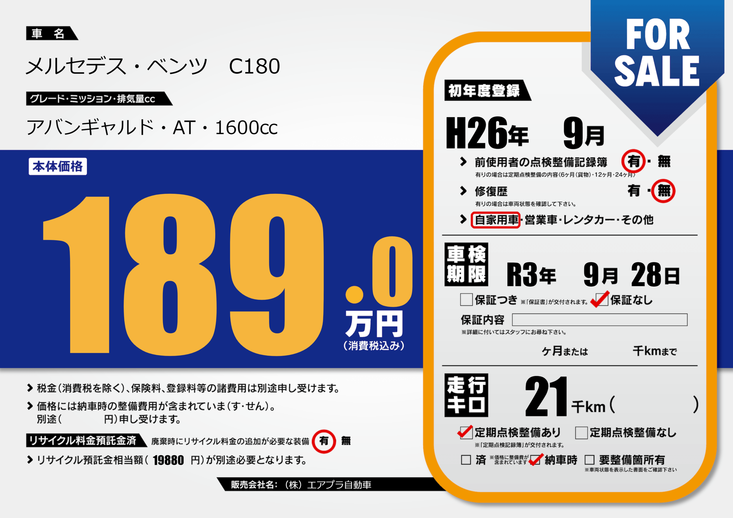 | 車名 | メルセデス・ベンツ C180 | グレード ミッション 排気量 |