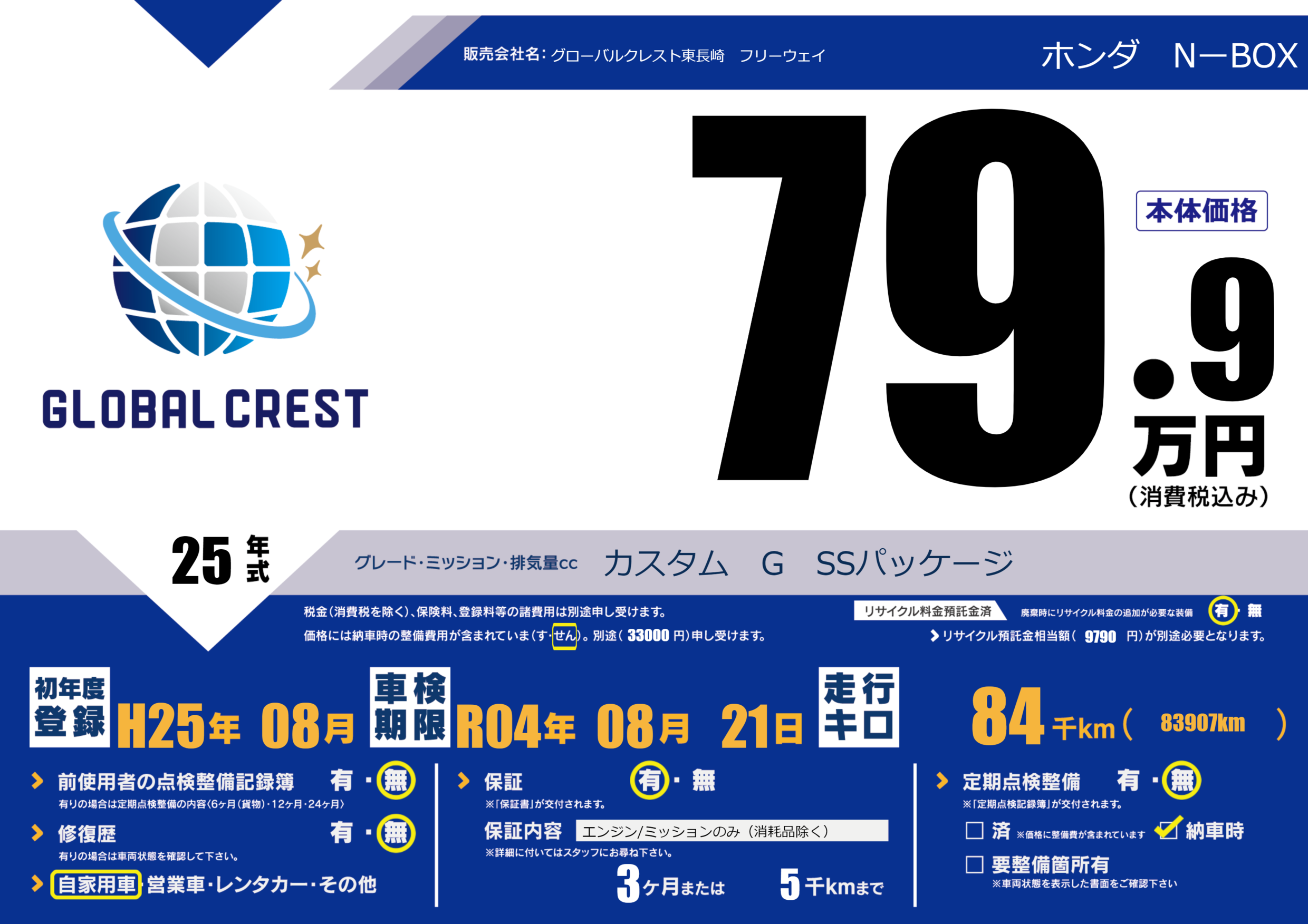 | 車名 | ホンダ NーBOX | グレード ミッション 排気量 |