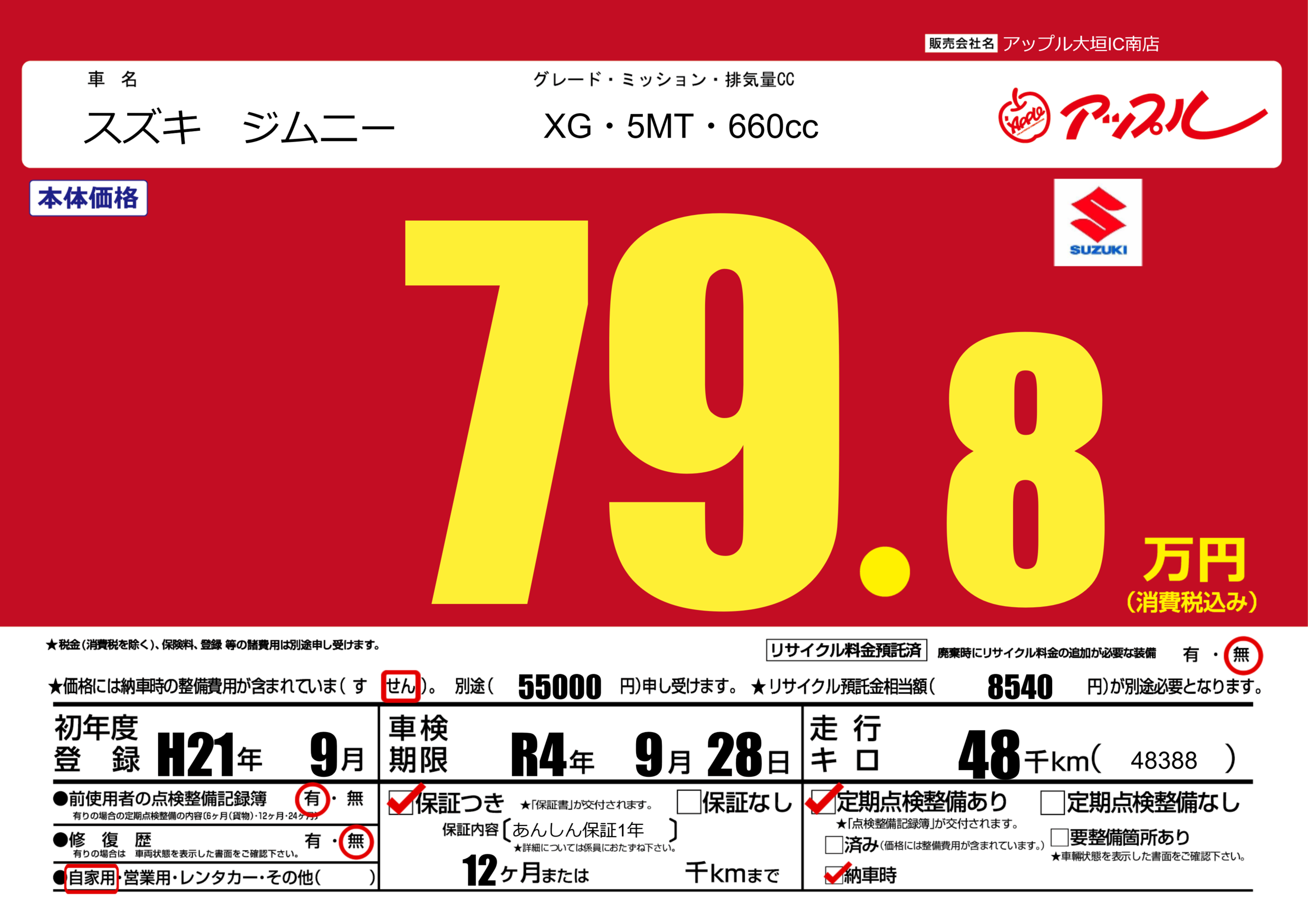 保証付き 保証内容(あんしん保証1年) 12ヶ月または()千kmまで |