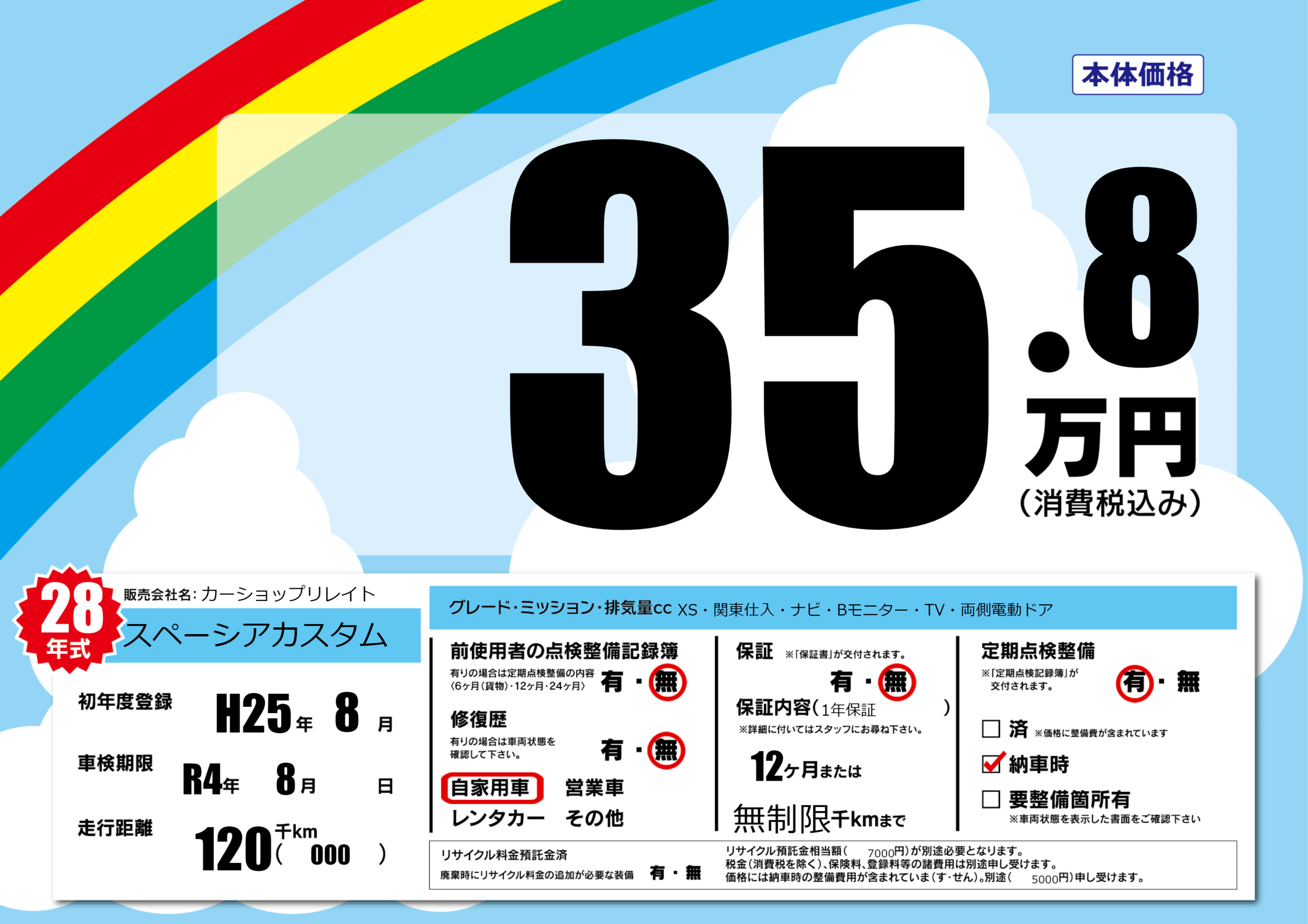 | 走行キロ | 12万km | 初年度登録 | H25年8月 |
