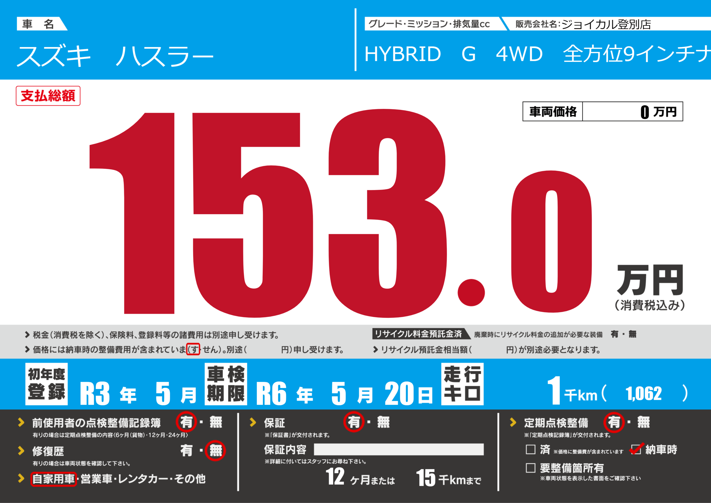 | 走行キロ | 0.1万km | 初年度登録 | R3年5月 |