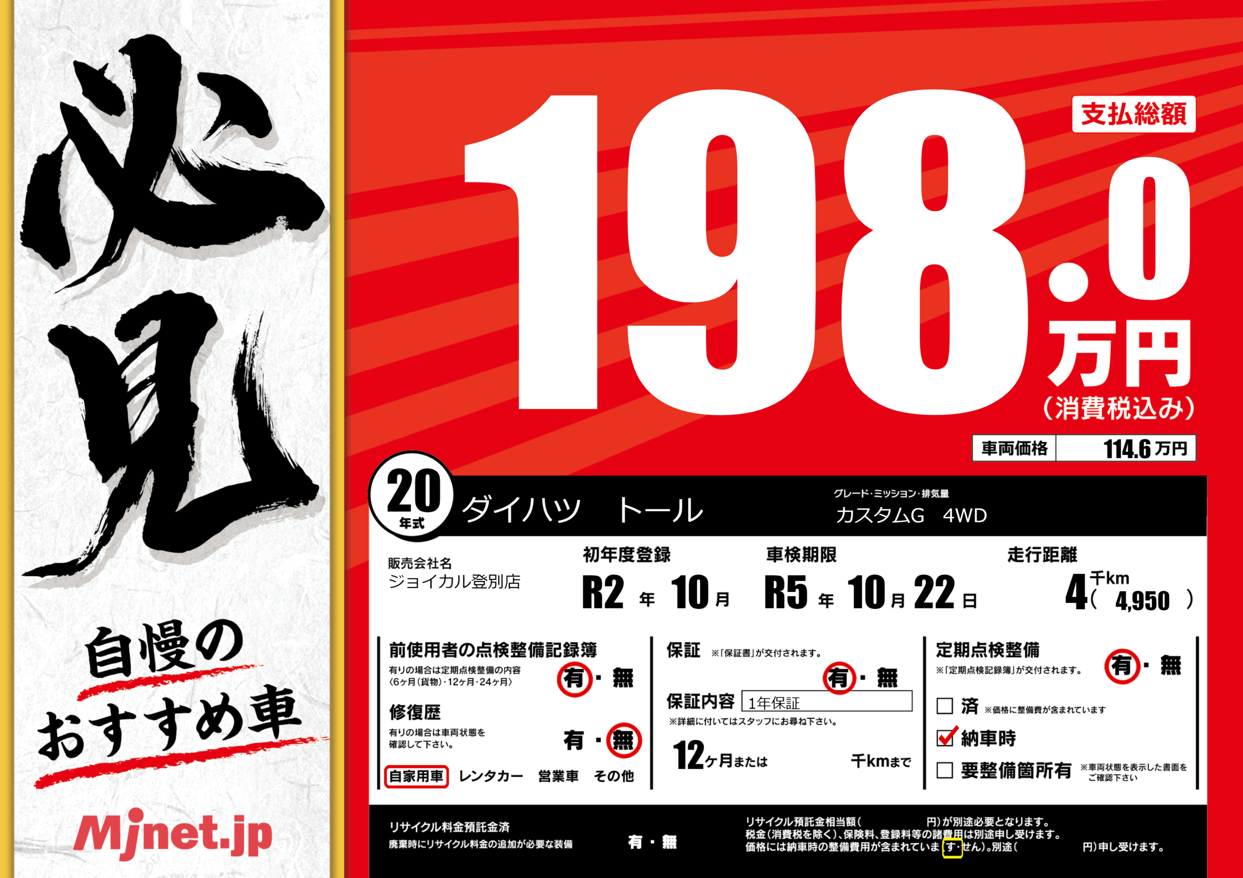 | 車名 | ダイハツ トール | グレード ミッション 排気量 |