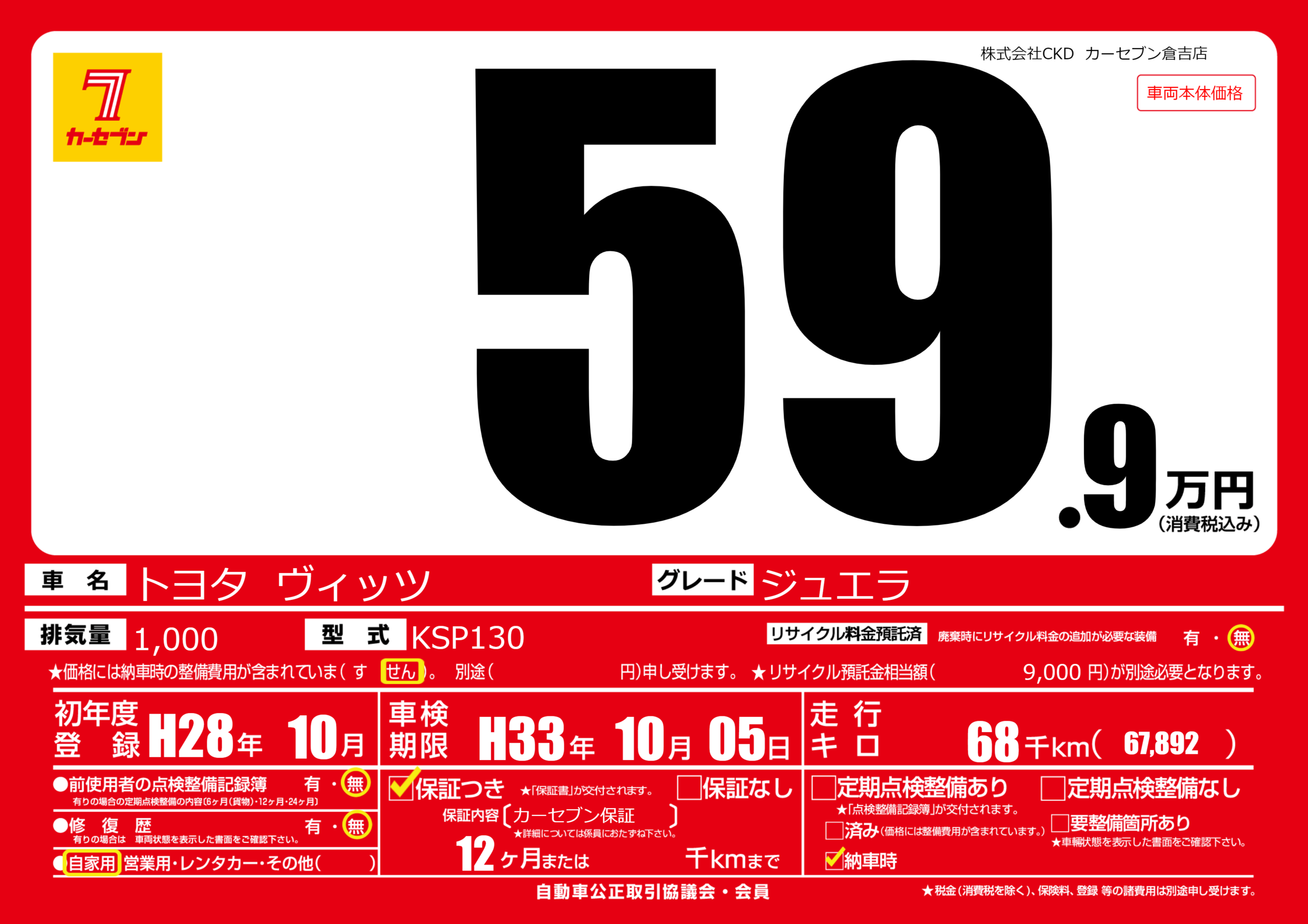 | 車名 | トヨタ ヴィッツ | グレード ミッション 排気量 |