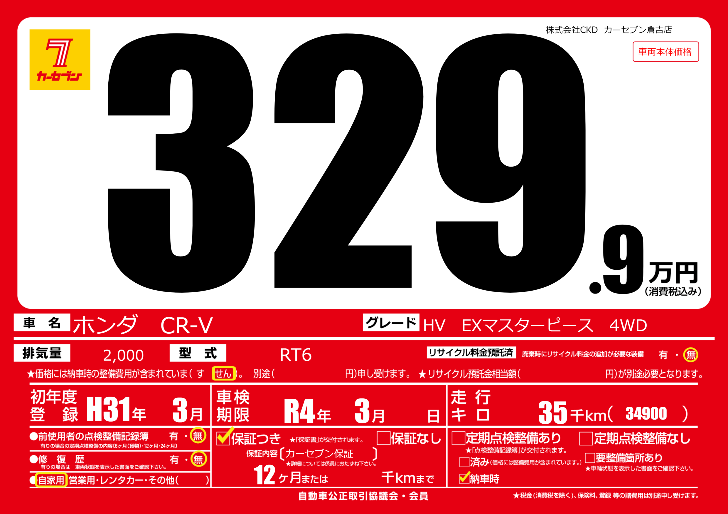 | 車名 | ホンダ CR-V | グレード ミッション 排気量 |